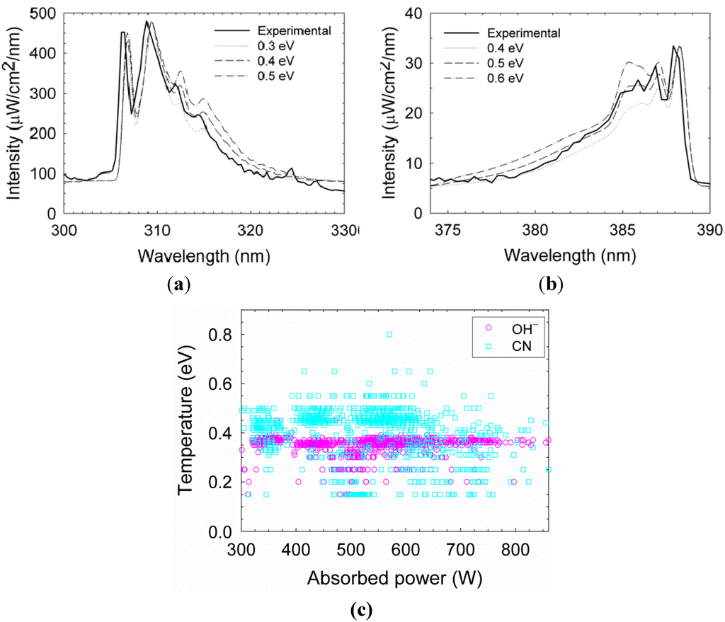 Temperature evaluation by fitting the radicals emission, (a) OH–; (b) CN by the LifBase simulation [27]; and (c) an accumulation of 941 fittings frames for OH– and 973 frames for CN with respect to the instantaneous effective microwave power. The mean temperature does not seem to vary significantly with power in this range.
