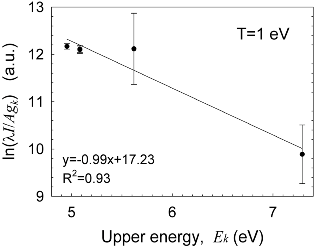 The Boltzmann plot technique [33] is applied to the silicon neutral lines, as shown in Figure 6, in order to estimate the excitation temperature. Assuming conditions for partial local thermal equilibrium (pLTE) as discussed below in Section 3.5, the Boltzmann equation for the intensity of the upper k to the lower i energy transition level; Iki, is given by ; where λki and Aki, are the wavelength and transition probability, respectively; kB is the Boltzmann constant; and Ek is the upper energy state with a degeneracy gk. Therefore, the slope of the curve obtained is inversely proportional to the plasma excitation temperature, Texc. The results show an excitation temperature of ~1 eV for the detected silicon lines. Impurities originating probably from the electrode are also observed, e.g., the chromium emission lines marked in Figure 7a. Similarly to the analysis of radical molecules presented above, the Boltzmann-plot technique applied to the chromium spectral lines results in ~0.3 eV as shown in Figure 7b (note that this plot may be more accurate than that for silicon in Figure 6 due to the larger number of chromium spectral lines, the partial overlap of the silicon lines and the NO radical emission, and the relatively low spectral resolution and sampling available).