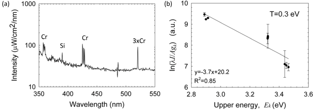 (a) An emission spectrum of silicon lines with chromium impurities; and (b) a Boltzmann-plot fit of the chromium lines resulting in ~0.3 eV excitation temperature. (Note a diode line defect at 485 nm in Figure 7a)