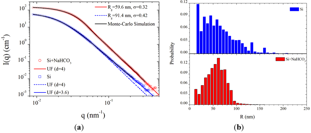 as in [13], where the whole scattering curve could be described by a single structural level with four parameters: radius of gyration (Rg); amplitudes G and B of the exponential and power law terms, respectively; and power law exponent (d). The best-fit parameters yielded the Rg and standard deviation (σ) as indicated in the upper legend of Figure 8a. In addition, a comparison with the scattering profiles obtained by Monte-Carlo simulation method [36] using 50,000 particles is also shown. The two plots in Figure 8b show the size distribution derived from the Monte-Carlo simulation method [36]. Evidently, these size distributions are more complex than typical log-normal distribution assumed by the unified analysis [35]. The mean particle radii from the simulations are 62.9 nm and 55.4 nm for the dry and damp conditions, respectively.