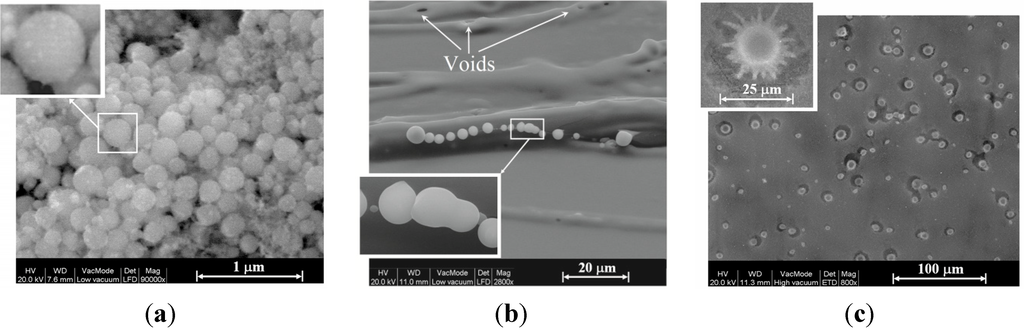 SEM observations: (a) aggregates of spherical particles, 0.1–0.3 μm in diameter, on the silicon emitter. The inset shows a typical sphere with a rough hairy surface that consists of smaller particles, ~10 nm in diameter. EDS analysis reveals mostly silicon and oxygen in these aggregates; (b) larger spheres, on the micrometer-scale in diameter, in a molten region, and voids of similar sizes; and (c) micro-spheres that seem to be smashed onto the copper collector plate. The inset shows a typical ~10 μm sphere of silicon that seemingly was crushed into the copper plate and has created a crater by hitting the surface.