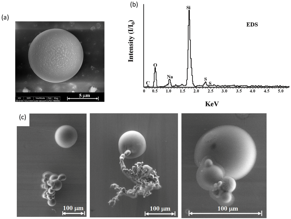 A typical perfect sphere, 8 μm in diameter; (a) the SEM image; (b) its EDS spectrum showing mostly Si and O; and (c) examples of micro-particles observed by SEM on the copper collector as clusters in various stages of agglomeration.