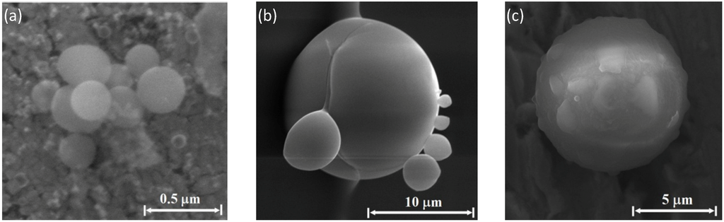 The EDS analyses of these spheres show the presence of Si as well as O, with small amounts of other elements including Cl, C and Cu. The smaller particles, up to ~80 nm in diameter, are also observed on the silicon emitter and in-situ by SAXS. Hence, one may deduce that the larger spheres agglomerate within the fireball while being elevated up to the collector. In view of these SEM images, one may deduce that some of these large spheres have evolved as hollow spheres with a ~1 μm thick shell, as seen by their crushed traces on the collector (Figure 9c).