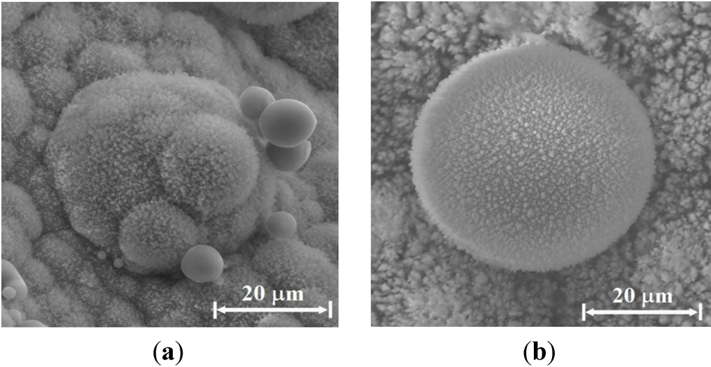 Examples of hairy sea-urchin-like clusters observed by SEM on the copper collector, as (a) was created by a Si-emitter, C-electrode, and Cu-collector system, in water-vapor sprayed air atmosphere; and (b) was obtained in the same conditions with sodium bicarbonate added to the water vapor inhalator.