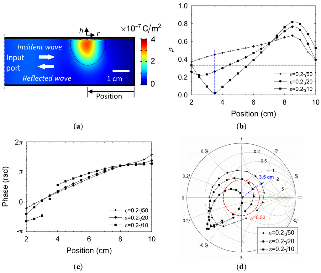 The amplitude profile of the displacement field D = ε0εrE along the waveguide is presented for instance in Figure 13a for εr = 0.2 − j20 (in which the reflections attain ). The corresponding reflection coefficients, amplitude and phase, are shown in Figure 13b,c, respectively, as functions of the axial position (i.e., the distance from the end mirror as indicated in Figure 13a) for several values of εr A nearly perfect impedance matching (no reflection) is observed for εr = 0.2 – j10 at an axial position of 35 mm. Other positions or higher dielectric losses of the plasmoid decrease its microwave absorption. This effect is illustrated also by the Smith-chart presentation in Figure 13d, which maps the complex relation between εr and the microwave reflection coefficient in various positions. The area within the dashed circle in Red marks the region, with less than 10% microwave power reflection. A longitudinal periodicity of about half a wavelength is notable in Figure 13b,c,d.