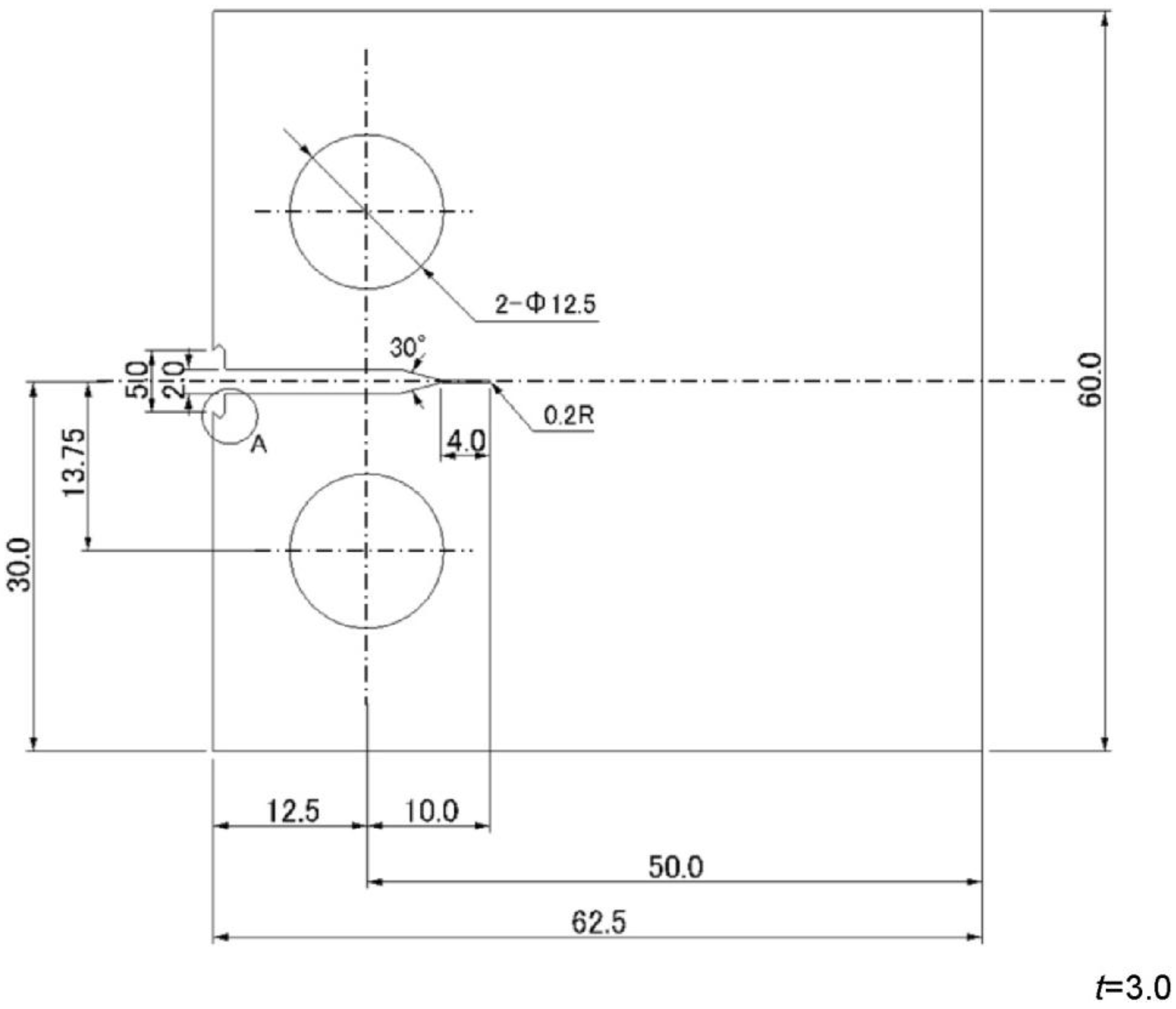 Austenitic stainless steel SUS316 was used as the experimental material. The chemical composition of the stainless steel SUS316 is C, Si, Mn, P, S, Ni, Cr, Mo and Fe, and their content rates are 0.05, 0.26, 1.3, 0.028, 0.03, 10.1, 17.09, 2.01 wt % and balance, respectively. The mechanical properties of the stainless steel SUS316, yield stress, tensile strength, Young’s modulus, Poisson’s ratio and hardness, are 300 MPa, 573 MPa, 193 GPa, 0.3 and 161 HBW, respectively. Compact tension (CT) samples were used and a schematic of the sample is provided in Figure 1. The samples were subjected to stress relief annealing to remove the residual stress induced during the machining process. The annealing process is described as follows. The samples were heated to 1173 K over a period 4 h. The temperature was then held constant at 1173 K for 10 min before the samples were allowed to cool to room temperature in the furnace. To facilitate the observation of the surface condition, the surfaces of the samples were polished to a mirror plane using a buffing machine.