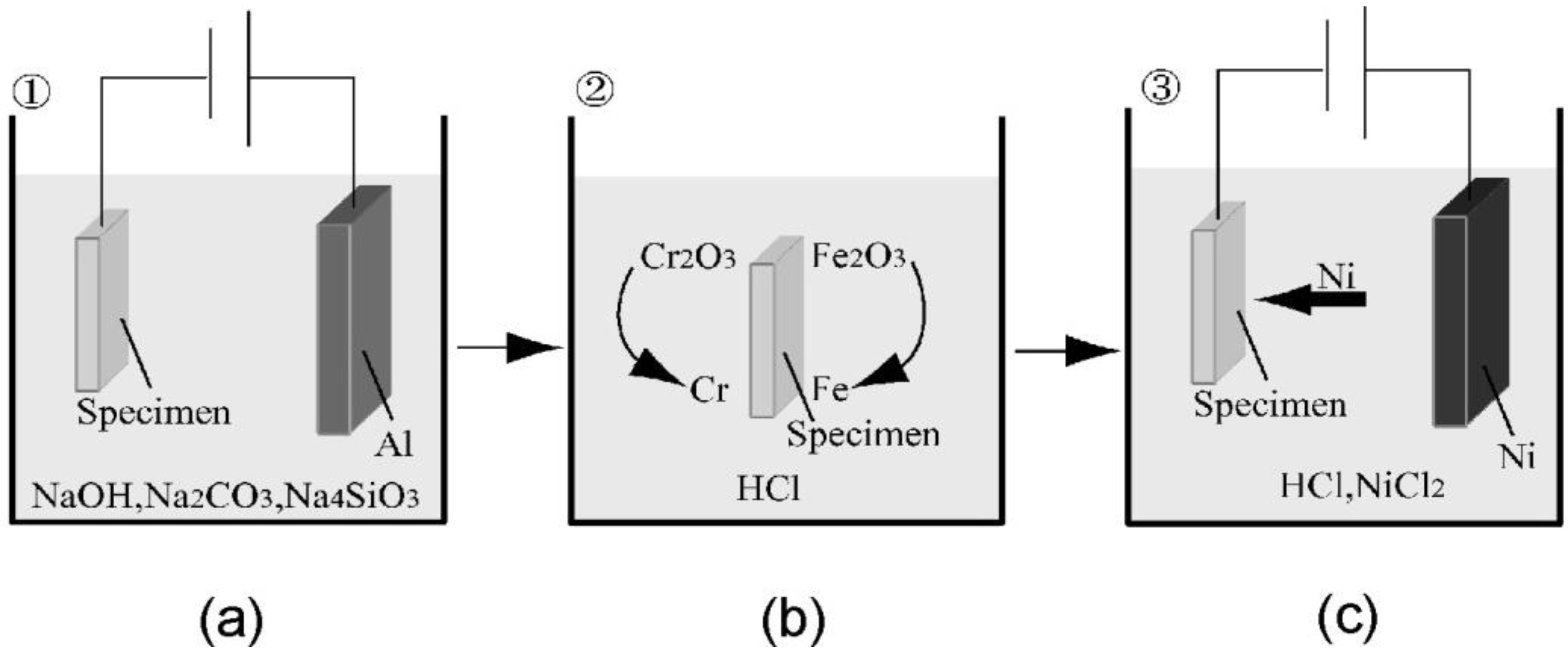 The samples were subjected to the SAPC [28] to eliminate the oxide layer on the crack surfaces. The SAPC comprises three stages: electrolytic cleaning, HCl activation, and Ni striking. A schematic representation of this process is provided in Figure 2.