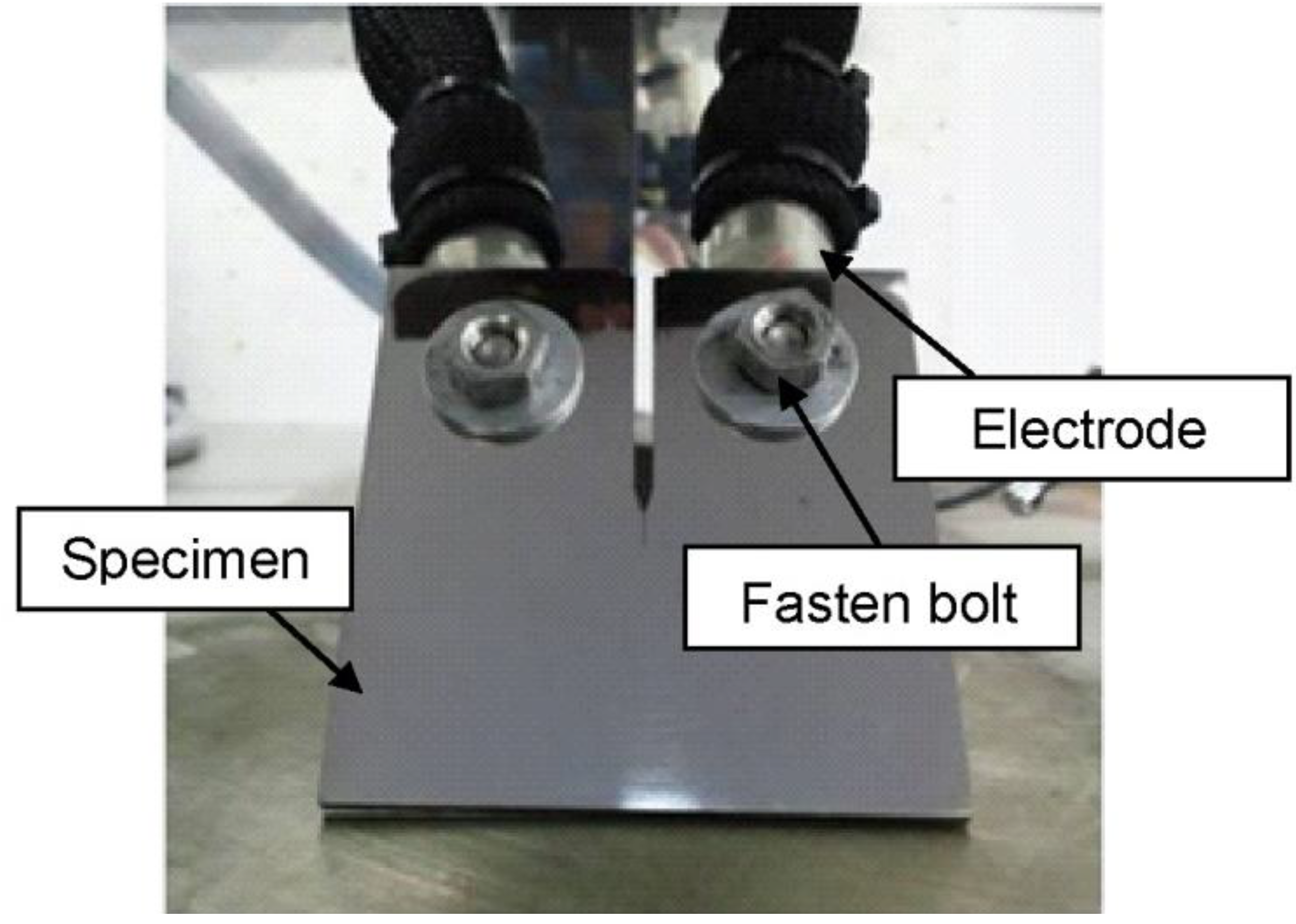 High-density electropulsing was applied to heal the fatigue crack. Electropulsing was carried out with a transistor-type power source in the range of 0.5–10 kA. The electropulsing was applied through the two electrodes with a pulse duration in the range of 0.5–10 ms. The electrodes were directly bolted to the sample as shown in Figure 3. The electropulsing conditions are shown in Table 2. Electropulsing was applied to the sample several times, and the state of the crack on the sample surface was observed with a scanning electron microscope (SEM) before and after the several applications of electropulsing.