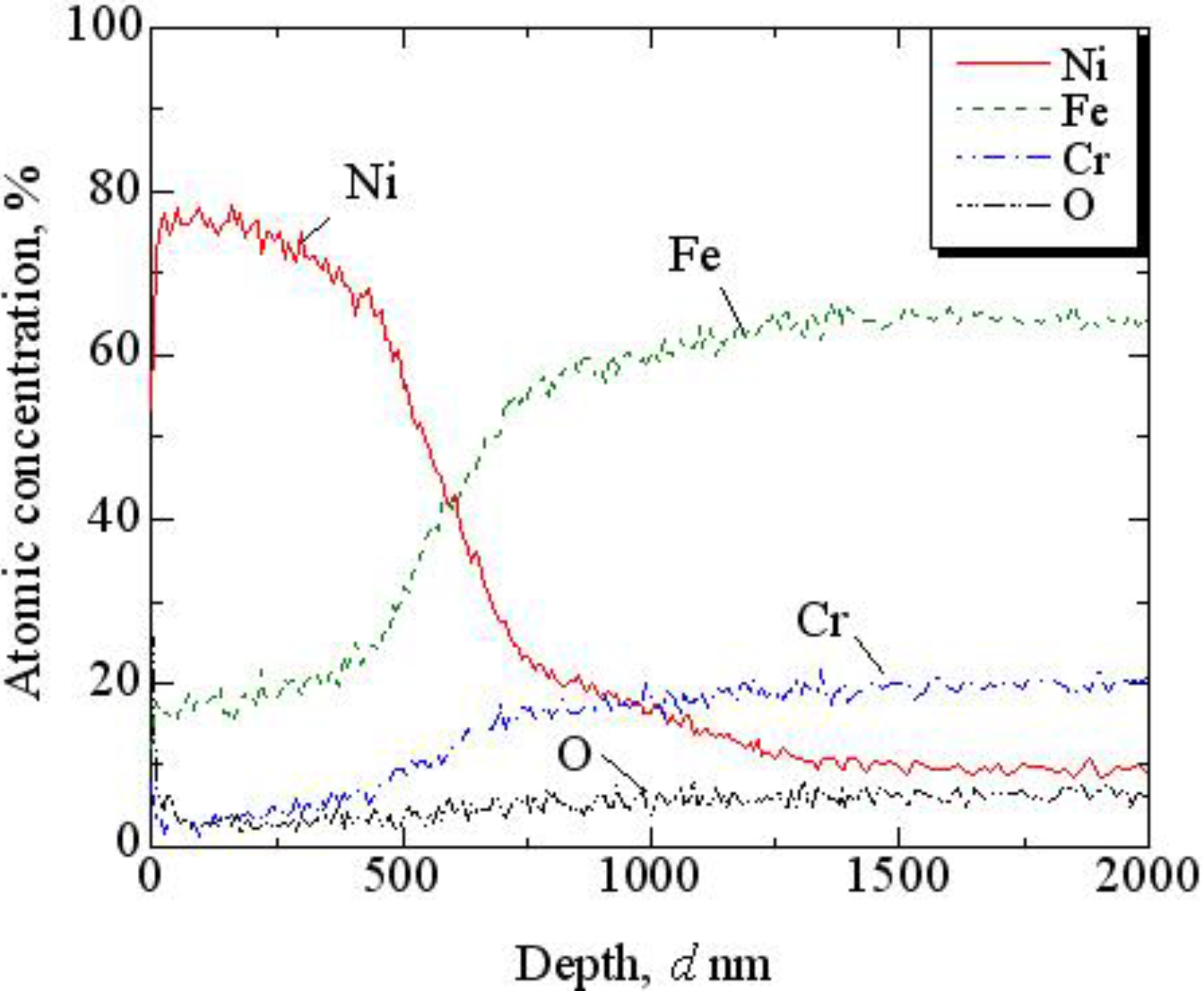 Relationship between the atomic concentrations of O, Cr, Fe and Ni and the depth from the sample surface after Ni striking.