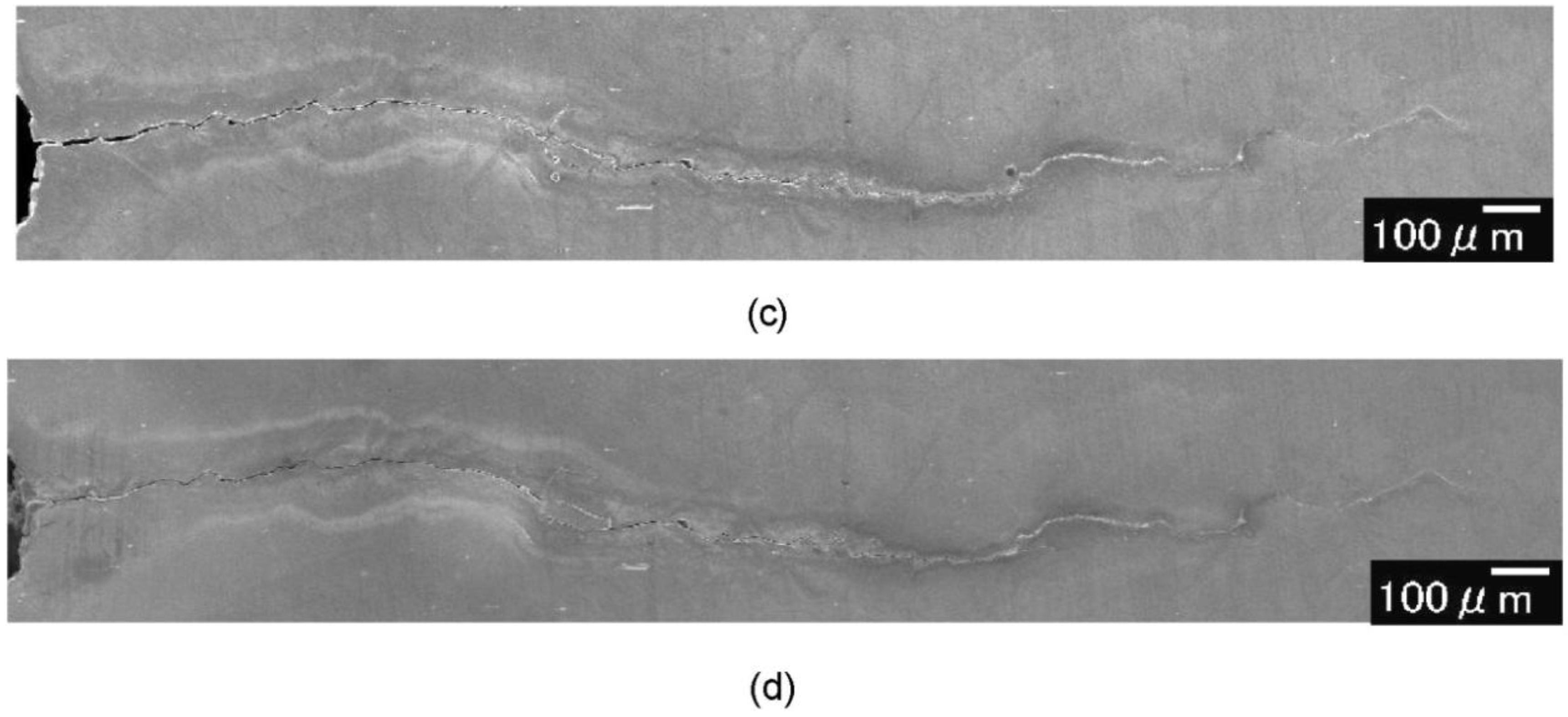 Magnified images of fatigue cracks in Figure 5: (a) before and (b) after 35 applications of electropulsing.