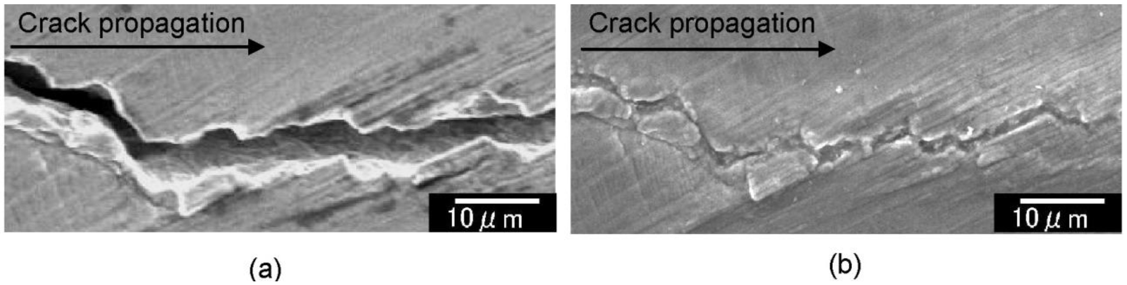 Figure 10 shows the crack growth rate for Sample C, which was treated with the SAPC, before and after the 20th application of electropulsing. The fatigue test was conducted at a constant stress intensity factor (ΔK = 25 MPa·m1/2). From Figure 10, it was observed that the crack growth rate decreased from 4.17 × 10−8 to 3.01 × 10−8 m/cycle immediately after the application of electropulsing. After the application of electropusling, the crack growth rate was lower than that before electropulsing application until the crack had grown to 3.6 mm.