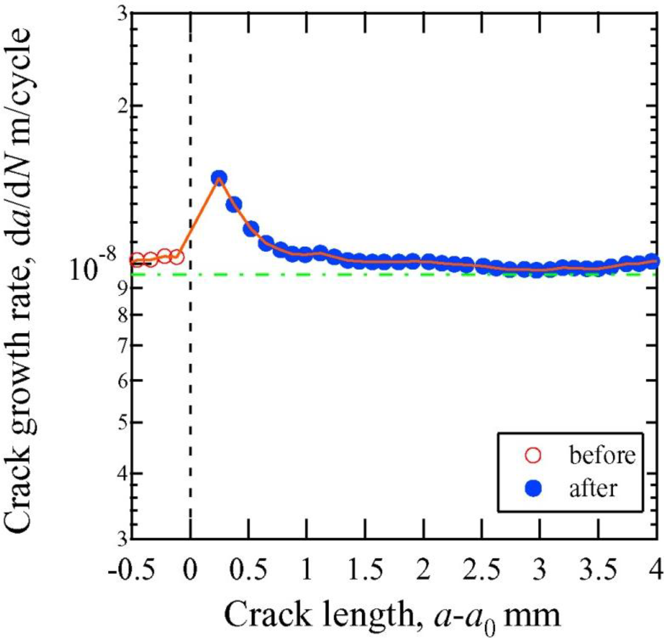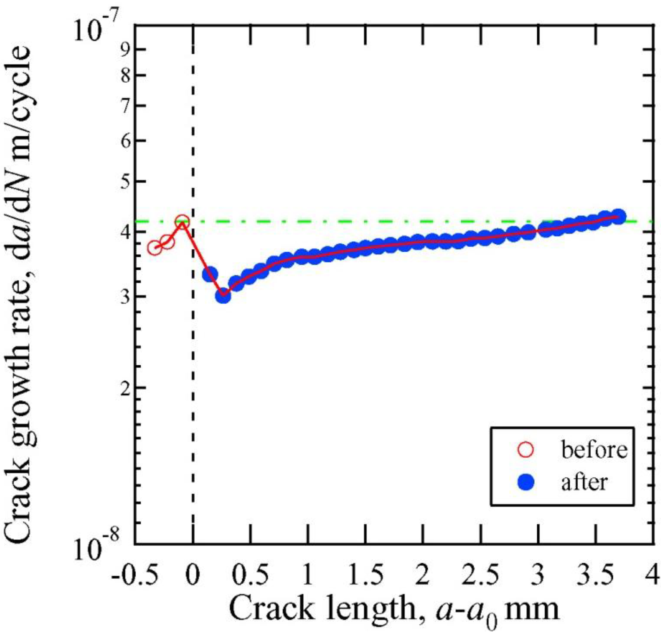 The growth of the fatigue crack was evaluated quantitatively in Samples B and C to determine the effectiveness of crack healing. Crack closure was confirmed in Samples B and C, as was observed in Sample A. Figure 8 shows the crack growth rate as a function of the stress intensity factor (i.e., Paris’ law) for the control sample in the absence of electropulsing. Figure 9 and Figure 10 show the relationship between the crack growth rate and crack length before and after electropulsing application in Samples B and C, respectively. In Figure 9 and Figure 10, a0 is the crack length before the application of electropulsing. The dashed line indicates the approximate value for the control sample when the fatigue test was carried out in the absence of electropusling. The open and solid symbols represent crack growth before and after electropulsing application, respectively.