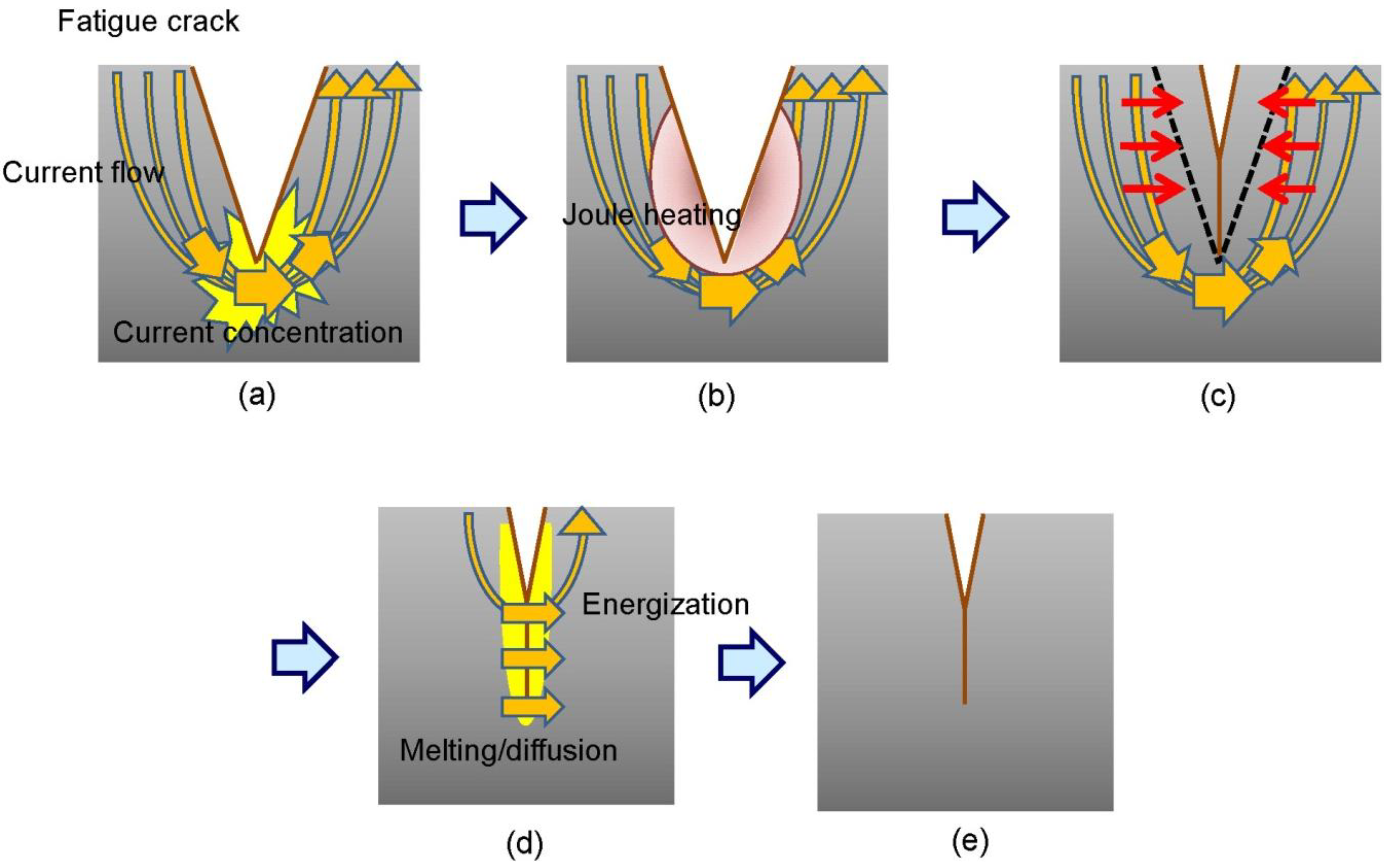 Representation of the crack closure process by the application of the electric current: (a) formation of a high-density electric current field at a crack tip; (b) local thermal expansion due to Joule heating; (c) crack closure resulting from thermal compressive stress; (d) bonding due to energization between the crack surfaces and (e) crack healing after the application of electropulsing.
