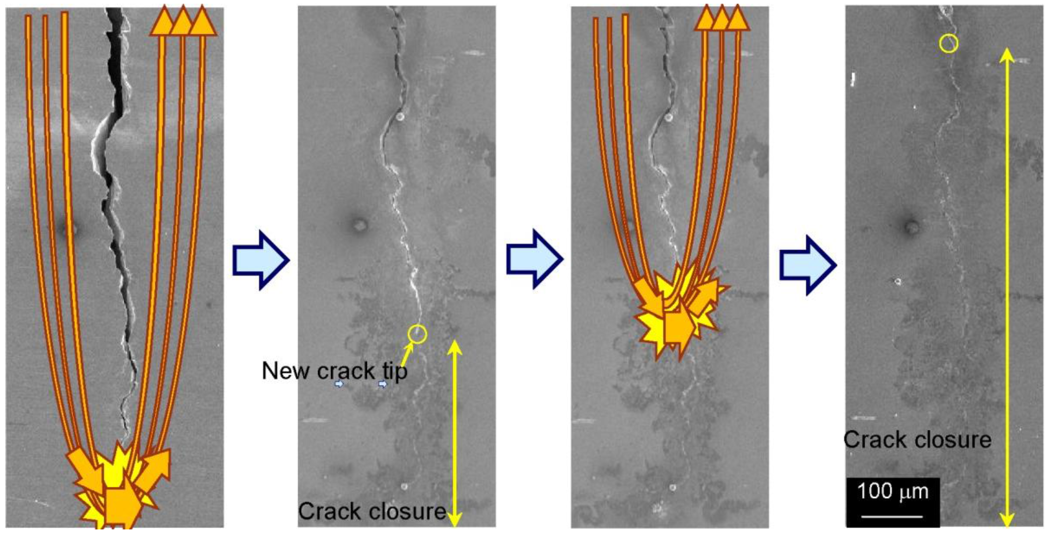 Fatigue is the main cause of failures in metallic structures. Various techniques have been developed to improve fatigue strength, such as high-frequency quenching, carburizing, nitriding, shot peening, and laser shock peening. Implementation of these techniques can prolong the fatigue life of materials because crack initiation is suppressed by hardening and residual compressive stress on the material surface [1,2,3,4]. However, the effectiveness of these methods is limited to materials where a crack already exists. Thus, it is important to develop a crack healing technique to improve the long-term reliability and durability of metallic structures with existing cracks.