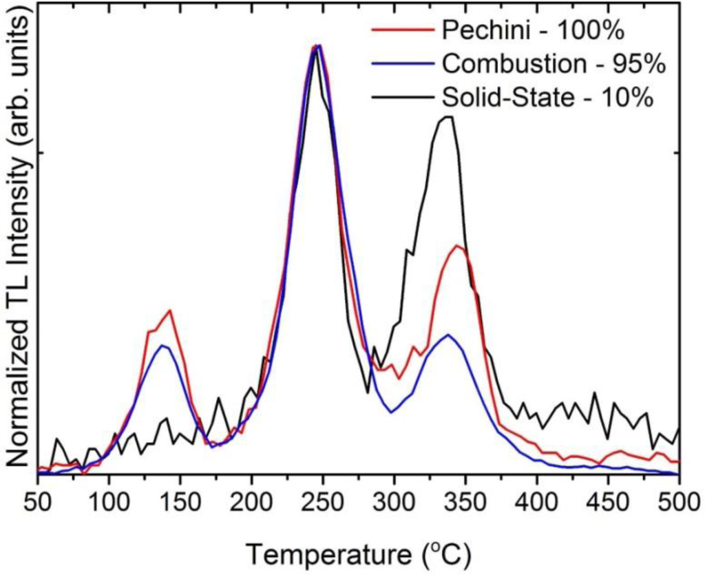 We shall see later that efficient thermoluminescence (TL) requires preparation of the ceramics at temperature as high as 1700 °C (the highest temperature we can routinely apply in our furnaces). Therefore let us start comparing the TL glow curves of ceramics prepared at such a temperature and N2-H2 mixture using initial powders prepared in different manners: the Pechini technique, combustion synthesis or by mixing commercial oxides. The thermoluminescence (TL) glow curves of three ceramics made using such powders are given in Figure 1.