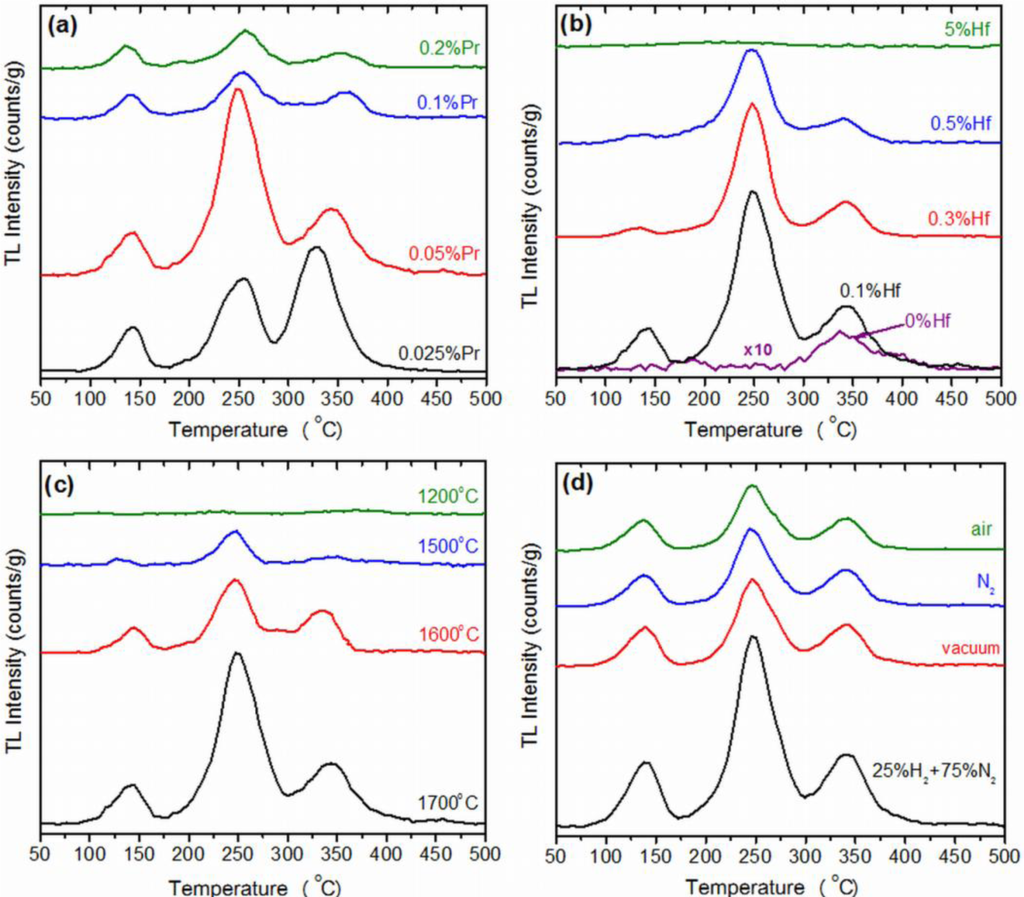Figure 2b presents TL glow curves for samples with fixed Pr concentration of 0.05% and varying content of Hf. The shape of the curves is very similar for all concentrations. Yet, the TL intensity reaches the highest level when the Hf content is 0.1%. Above this value the TL efficiency gets reduced continuously though not rapidly. Hence, the ability for energy storage in Lu2O3:Pr,Hf is tremendously susceptible to the concentration of Pr and less, though noticeably, sensitive to the content of Hf. Yet, both dopants are needed to form an efficient energy-trapping system in the lutetia host. In the next step, we shall try to determine the optimal sintering temperature and atmosphere of the Lu2O3:Pr,Hf storage phosphors.