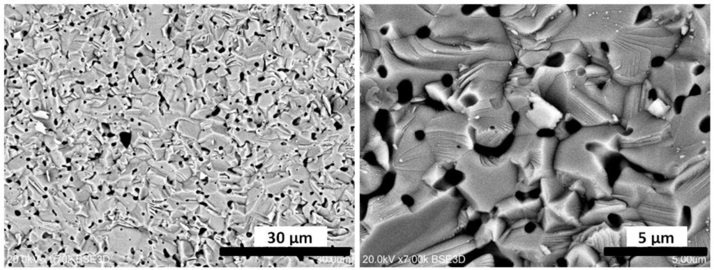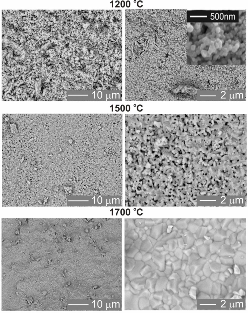 Figure 4 shows SEM images of Lu2O3:0.05%Pr,0.1%Hf ceramics obtained at various sintering temperatures: 1200 °C (Figure 4a), 1500 °C (Figure 4b) and 1700 °C (Figure 4c). Evolution of the morphology with sintering temperature appears to mirror growth of energy storing efficacy presented in Figure 2c and discussed above.