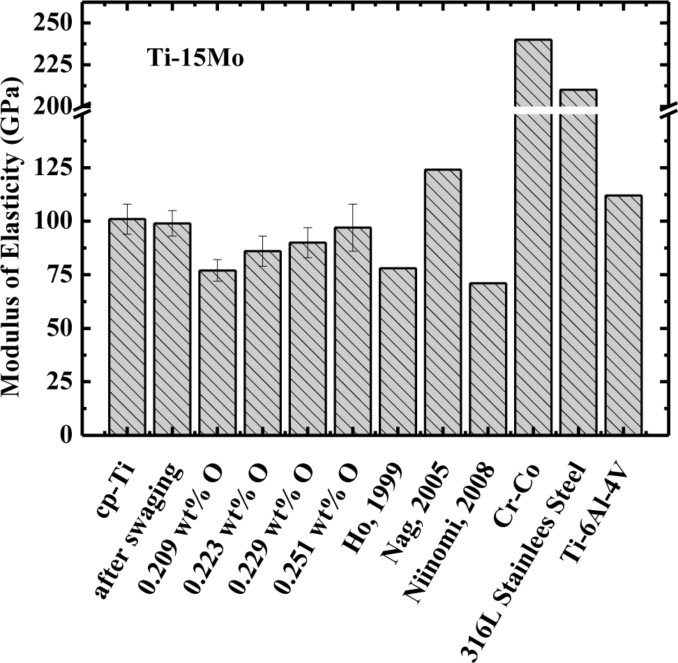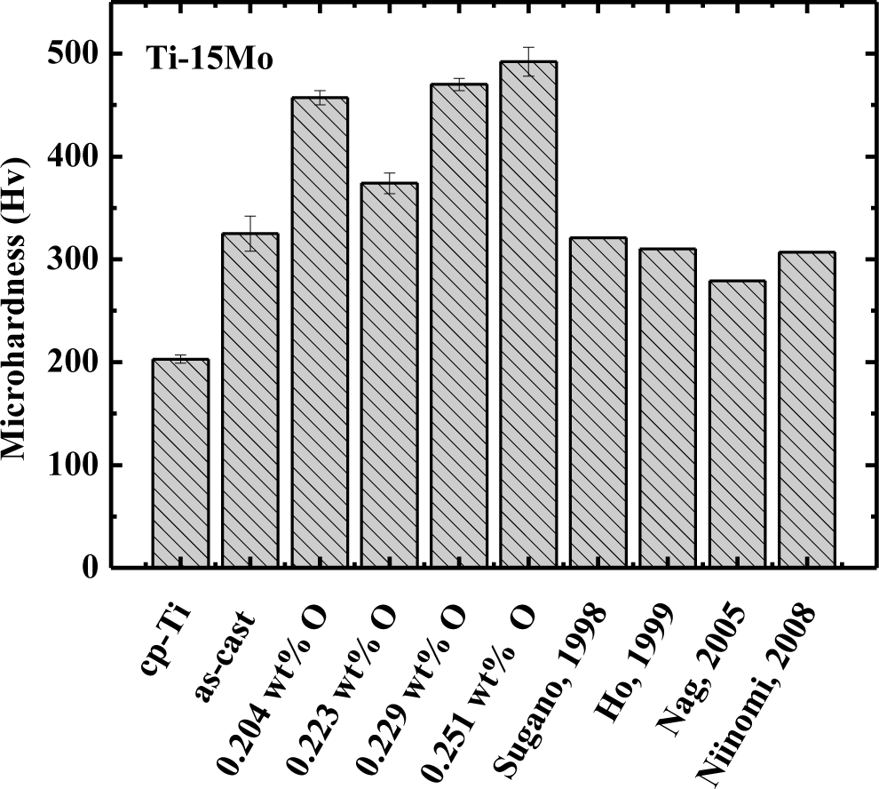 Martins Jr. et al. [14] prepared Ti–15Mo alloy using arc-melting and measured modulus of elasticity, microhardness, and biocompatibility, observing that this alloy has smaller modulus and greater microhardness than cp–Ti. In addition, these authors performed indirect cytotoxicity assays and cell viability, showing satisfactory response from the alloy.