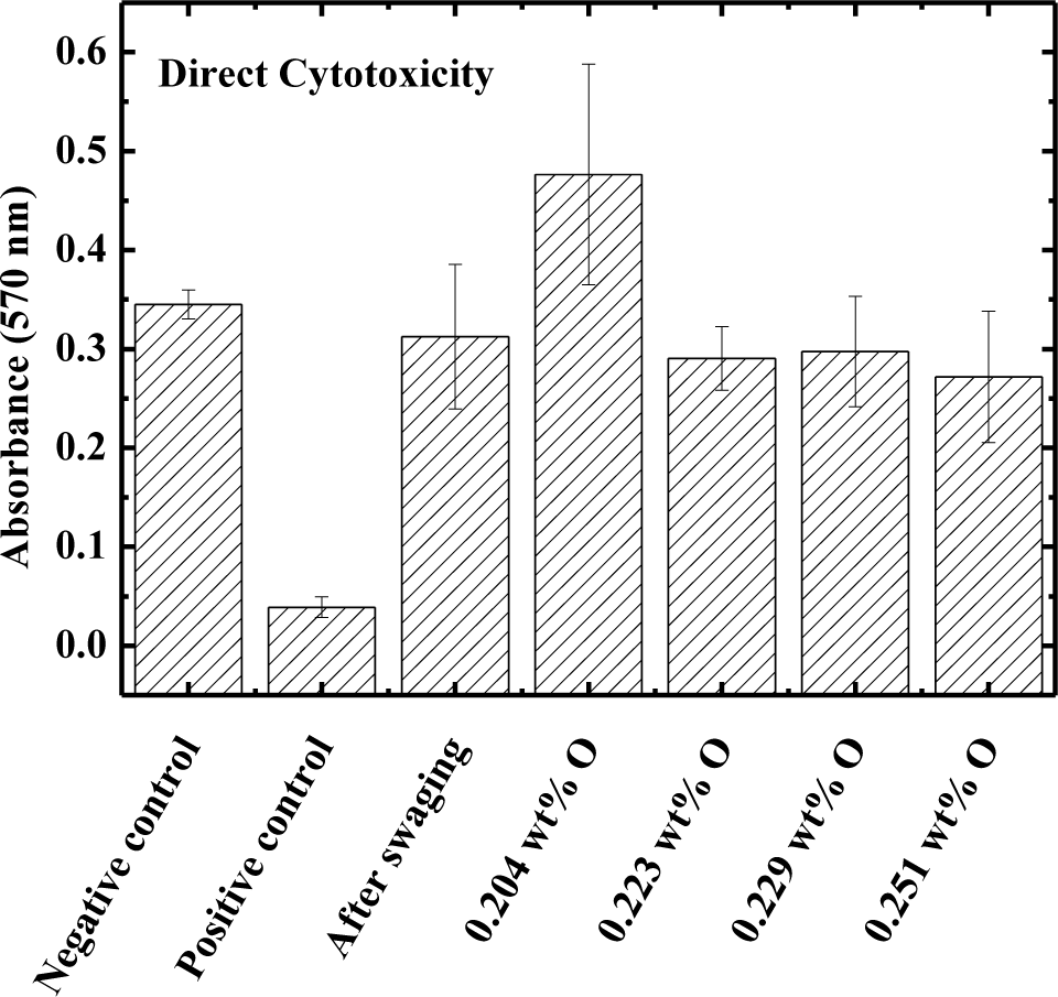 The direct cytotoxicity test results are shown in Figure 3 for the Ti–15Mo samples after swaging, after heat treatment, and after oxygen doping. Phenol was used as positive control and the culture dish was used as negative control. The results show that the absorbance values for the samples of Ti–15Mo under all conditions studied are closer to the negative control, i.e., negative for cytotoxicity. In this way, the various processing conditions do not affect biocompatibility [27].