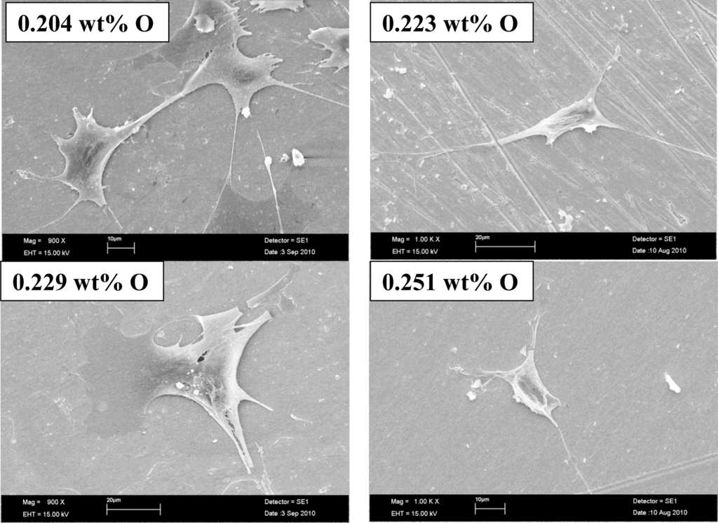 The Ti–15Mo alloy has its mechanical properties strongly altered by heat treatments and by addition of interstitial elements, such as, oxygen, for example. In this sense, the objective of this paper is to analyze the effect of the introduction of oxygen in selected mechanical properties and the biocompatibility of Ti–15Mo alloy. The samples used in this study were prepared by arc-melting and characterized by density measurements, X-ray diffraction, scanning electron microscopy, microhardness, modulus of elasticity, and biocompatibility tests. Hardness measurements were shown to be sensitive to concentration of oxygen. The modulus results showed interstitial influence in value; this was verified under several conditions to which the samples were exposed. Cytotoxicity tests conducted in vitro showed that the various processing conditions did not alter the biocompatibility of the material.1. Introduction