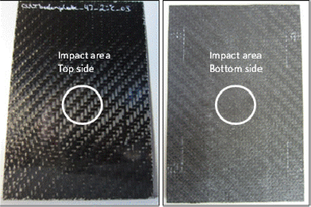 For lower impact energies (less than approximately 3 J), the primary damage mode was indentation-induced matrix cracking on impacted surfaces. There were minor matrix cracks on the bottom side of the test specimen, and some delamination could be possible between the inner layers (Figure 12). As shown in Figure 7 (3J_01–03), the impact curve is a closed one, and compared with the visual detection of the top side up or the bottom side up (Figure 12), there is no penetration and/or perforation. As a result of these analyses, there are no failures detected. Nevertheless, interior layer delamination could be possible, but was not detected with the mentioned methods.