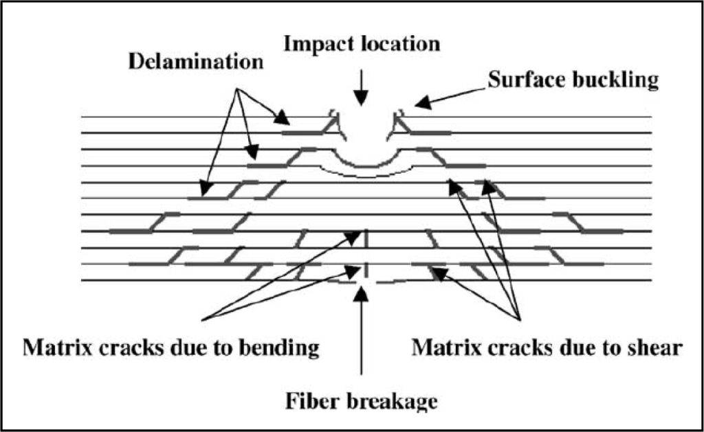 Impact energies can induce complicated forms of damage, for example, as shown in Figure 2. Damage in composites often begins on the non-impact surface or in the form of an internal delamination, and often, the detection and characterization of impact damages are difficult. The impact damage mechanism in a laminate constitutes a very complex process. It is a combination of matrix cracking, surface buckling, delamination, fiber shear-out and fiber fracture, etc., which usually all interact with each other. The delamination caused by the mismatching of the bending stiffness was propagated and aligned along the direction of the fibers [1,13,14]. The delamination pattern is dependent upon the structure of the fabric. It requires an understanding of the basic mechanics and the damage mechanism [15]. As a matter of fact, composites can fail in a wide variety of modes, because nearly every impact damage mechanism reduces the structural integrity of the component. Even barely visible impact damage can cause fatal destruction to the composite parts, because most composite parts are brittle and, therefore, can only absorb energy in an elastic mechanism or damage mechanism [16]. Impact behavior is even more difficult to understand in applications where hybrid composites are used. In many advanced engineering applications, such as the automotive and aviation industries, hybrid composites have been extensively used due to their high strength, low weight, good fatigue life and corrosion resistance. In addition, their behavior under impact loading has been of significant concern in engineering. There are many studies in the literature [17–22] of the impact response of composite materials and structures. For example, Ying [23] has investigated the damage resistance of three types of carbon laminates and fabric reinforced composites and used finite element analysis coupled with a failure technique to predict the impact threshold energy of the laminates. Low velocity impact damage to composite parts, most of the time, are due to both operational and maintenance activities. In the operational environment, there are typically few incidents of low velocity impact damage, and most can be attributed to hailstone strikes and foreign object damage, such as runway debris, e.g., stone thrown by the tires. The major source of low velocity impact damage for structural composite parts is due to mishandling and maintenance mishaps that include part transportation, handling and storage, and incidental tool drops. However, the impact energy is initially absorbed through elastic deformation till a threshold energy value. Beyond this value, impact energy is absorbed through both elastic deformation and the creation of damage through various failure modes. The type of failure depends on the material and geometric properties of both the impactor and target materials. It has been documented by several investigators that damage initiation is manifested in the load-time history as a sudden load drop due to the loss of stiffness from unstable damage development. Subsequently, damage growth will arrest; the composite laminate will reload, and a cycle of damage propagation and arrest occurs until the impactor begins to rebound and the laminate is unloaded [24,25]. However, damage in composites often begins on the non-impacted surface or in the form of an internal delamination. To gather more information about the damage profile caused by an impact test, many testing procedures are used. Several inspection techniques (acoustic emission, thermography, dye penetrant, stereo X-ray radiography, ultrasonic), with different sensitivity levels, can be used for the non-destructive evaluation of composite materials. All these testing procedures are divided mainly into area detection, e.g., thermography analysis and single-point detection, e.g., ultrasonic analysis. Many investigators have studied the empirical relationship between the initial kinetic energy of the impact projectile and the area of the damaged region detected by mainly single-point detection, like ultrasonic analysis. However, in the case of barely or not visible low impact damages, single-point detection methods are stretching their limits, because screening a large area is not economic and requires too much time. In that case, detecting the damages is part of the area detection, like thermography analysis, and ultrasonic analysis is a part of further analysis to get more information about well-known damage spots [6–8].