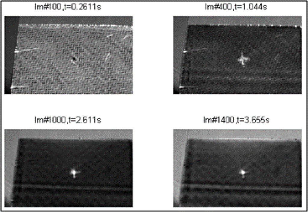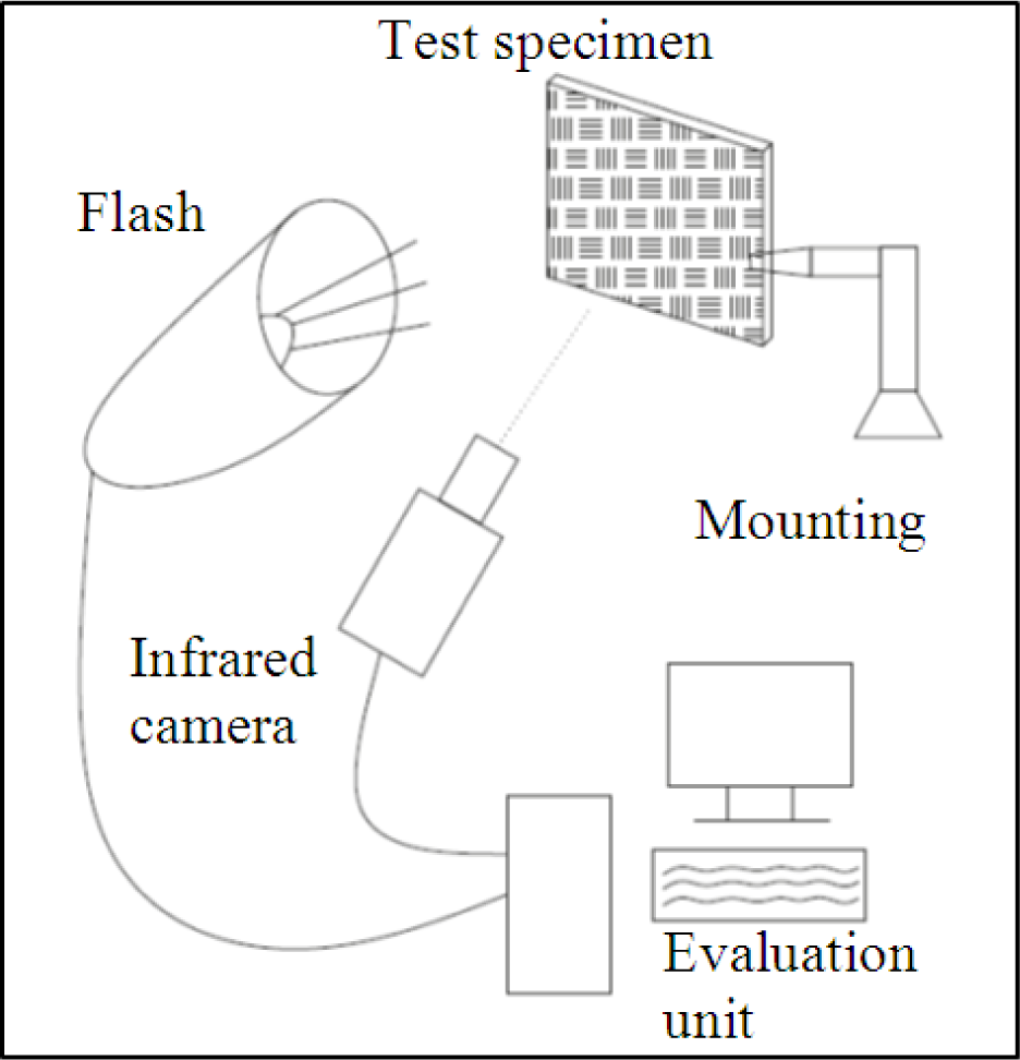 In our experiments, a flash lamp was used with a 1 ms (full-width half-maximum) heating pulse with an energy of 6 kJ from one xenon flash lamp at a distance of 60 cm from the specimen. The heated side of the CFRP samples was imaged with a commercially available cooled 320 × 256 pixel InSb (indium-antimony detectors) camera, operating at 385 Hz in the 1.5–5 μm spectral range (Figure 3).
