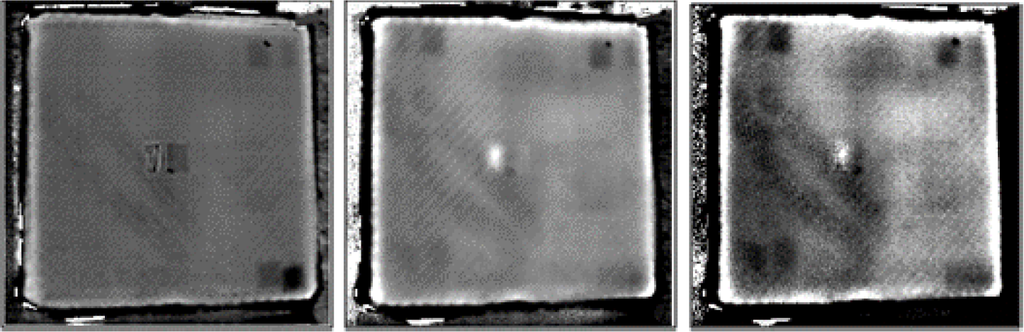 The advantages of the thermography testing are that not only the subsurface defects can be made visible, but also, according to the delay of the response, their depths can be estimated. Teflon inserts are often used in CFRP structures to create artificial delaminations. A specimen, as shown in Figure 3, has been prepared with five layers and with Teflon inserts between them. The temperature response to a flash pulse heating has been evaluated by the PPT technique, following a TSR step, to increase the signal-to-noise ratio of the images. Figure 6 shows the results, and the figures from left to right demonstrate that with the evaluation of different frequencies, it is possible to make deeper and deeper images of the delaminations.
