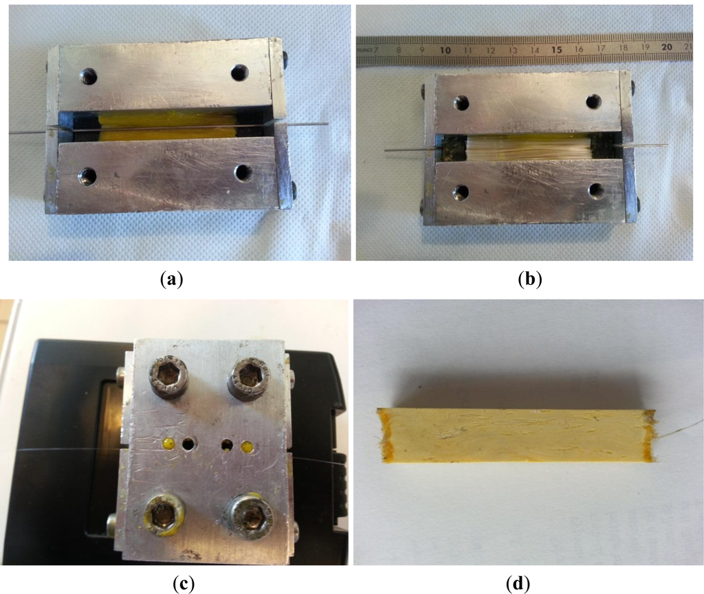 The sample preparation consisted of incorporating the glass fiber in the resin into a mold and embedding the optical fiber centrally positioned into the sample. As seen in Figure 1, the glass roving is placed in the mold and, superimposed layer by layer (6 roving), is carefully impregnated with the resin until half the mold is filled, and then a fine steel cylinder guide is placed on top in order to allow optical fiber insertion. The mold is filled in, as previously described (other 6 roving), and then the optical fiber is gently inserted in the fine guide. Before closing the mold with a controlled screw torque of 2 Nm, the steel guide is gently and carefully extracted. For safety reasons, all operations were performed into an extractor hood.