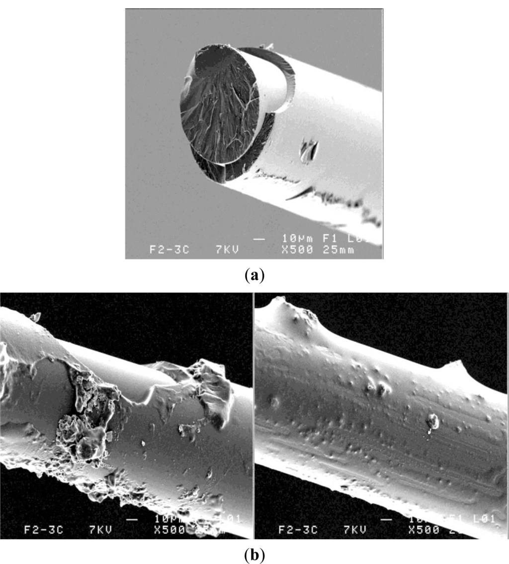 As optical fiber surface has determined fracture to a large extent, external coating appears critical. This coating is polymeric in most cases, and modern optical fibers are coated by two different layers: a soft coating at glass surface and a hard coating at external surface. The coating makes a protection against scratches that occur in normal handling and it reduces water activity at glass surfaces. Polymeric coatings (e.g., epoxy-acrylate) are preferred in practice because they are more efficient at inhibiting surface defects. As one will notice later in our study, regarding MEB examinations (see Section 3.3), fiber F1 has the typical section with two layers, but fiber F2 was subjected to a thermal treatment and presents one layer surrounding the silica core.