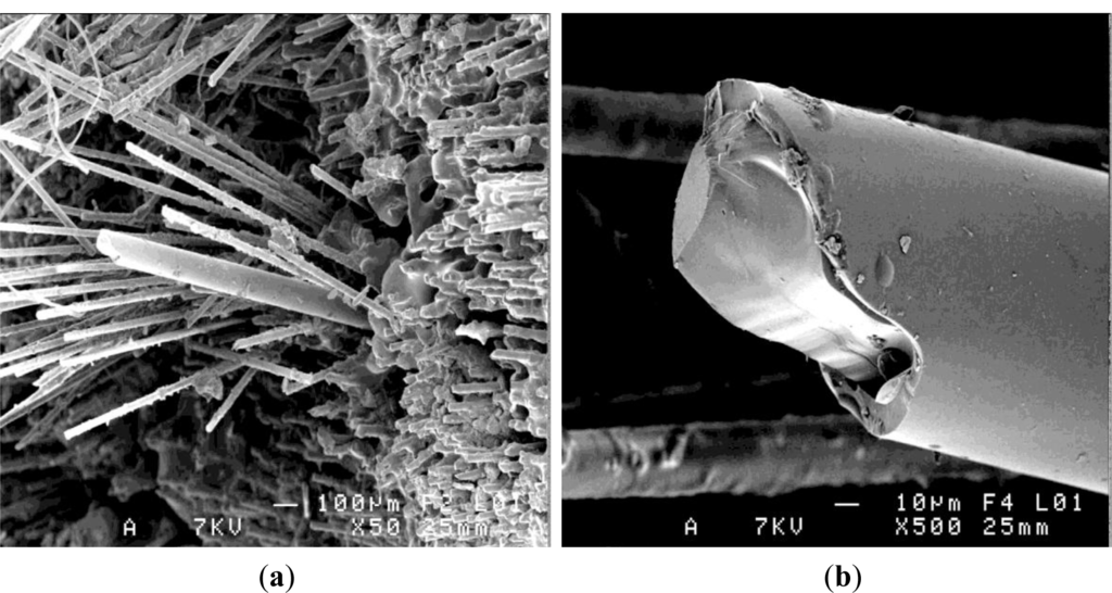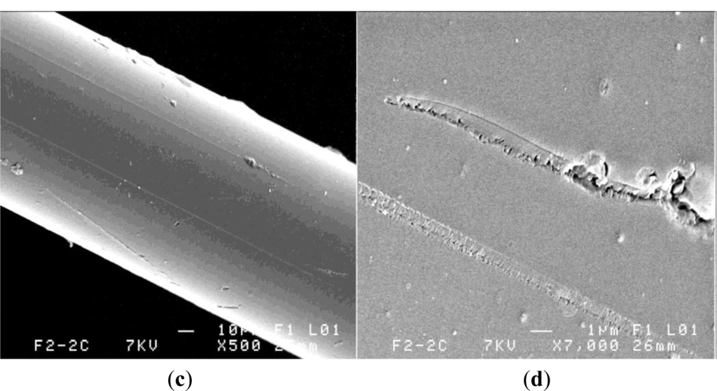 At the silica/polymer coating interface the coherence appears affected, as seen in Figure 8b, and this polymer detachment around the silica seems to be responsible for the low interfacial adhesion stress in case of resin and composite embedding F1 fiber. As noted, the resin filaments on the optical fiber external coating appeared more frequent in the composite case, Figure 8c.