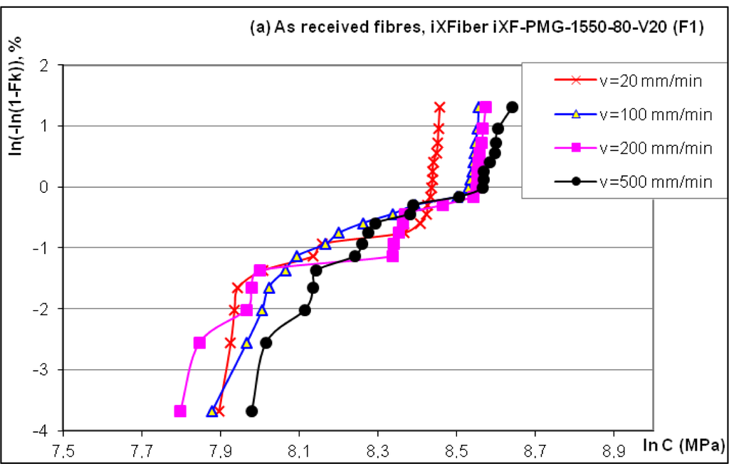 Weibull plots corresponding to the fiber denoted by F1 (two polymer layer coating to protect the silica core) are given in Figure 3a.