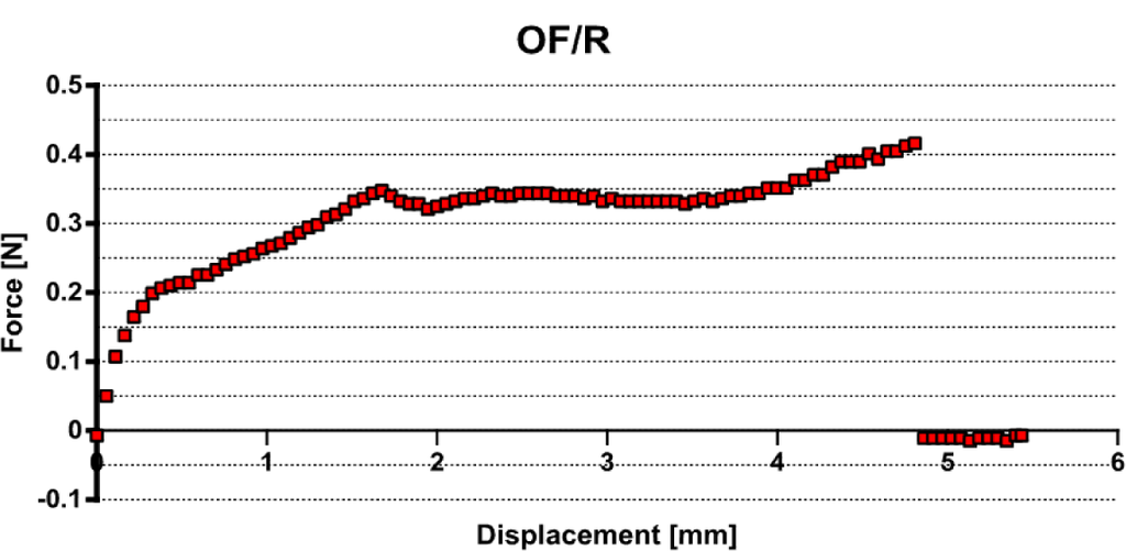 In the case of optical fibers embedded in resin, noted OF (F1)/Resin, a poor interface adhesion is reported for all samples with a maximum of 0.98 N. Using the linear model Equation (1), an interfacial adhesion stress of 0.46 MPa is reported. The pull-out curves are similar to Figure 4.