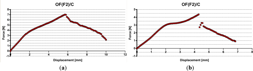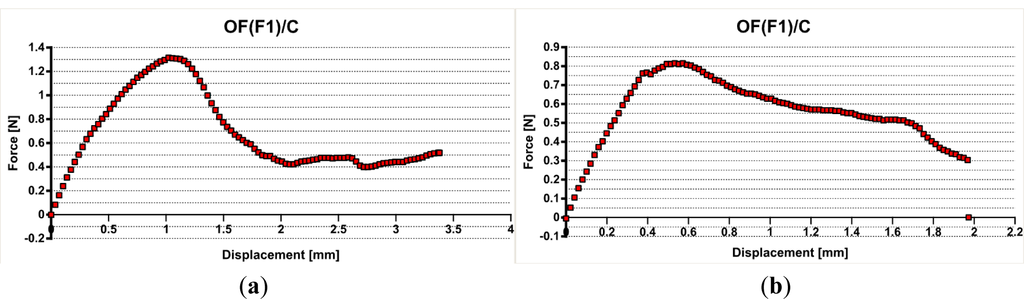 The optical fiber F1 embedded in the composite presented poor adhesion interface, too, slightly higher than the resin, but still low. A maximum value of 1.32 N (see Figure 5a) was recorded that corresponds to an interfacial adhesion stress of 0.66 MPa. but in the most cases debonding forces of 0.8–0.9 N were registered (see Figure 5b), leading to similar stresses as for non-reinforced matrix case.