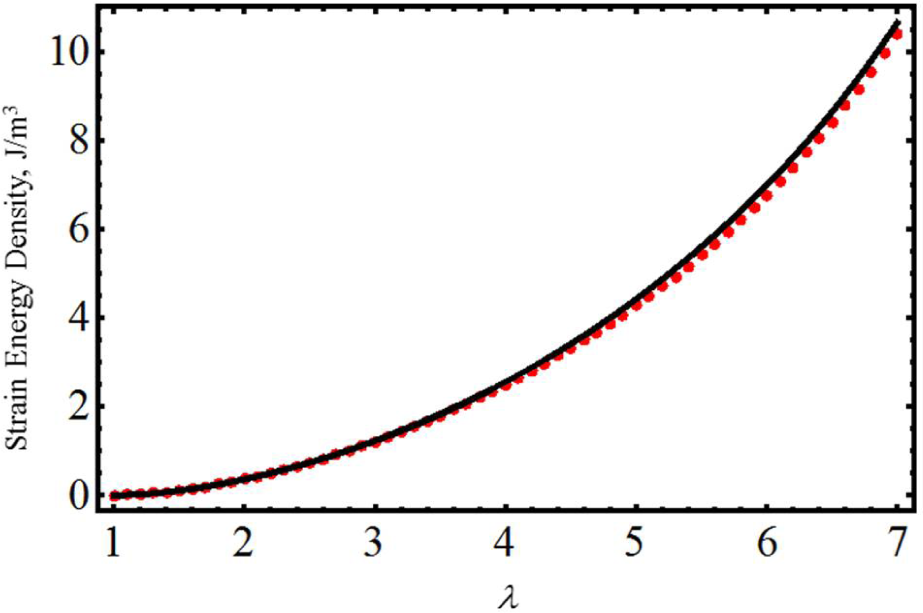 Before we use Equation (16) to derive constitutive models to characterize biological materials, let us first assess the accuracy of Equation (16) by using the experimental data collected by Toki and coworkers [9]. The red dots of Figure 1 represent the experimental strain energy density data obtained by integrating the stress versus stretch data shown in Figure 1 of [9]. In our Figure 1, the black solid line represents the predicted strain energy density found from Equations (8) and (16), with material parameter values of A1 = 0 MPa, A2 = 0.0001 MPa, c = −0.1880 J/m3, μ = 0.475 MPa and N = 28.13. As expected, the value of the equivalent anisotropic volumetric fraction contribution is fixed at f = 0.25. This value of f agrees with the percentage of the anisotropic material found in [9] via in situ synchrotron wide-angle X-ray diffraction (WAXD) at each strain during loading and unloading of the material samples. Notice from Figure 1 that the computed strain energy density follows the experimental data well.