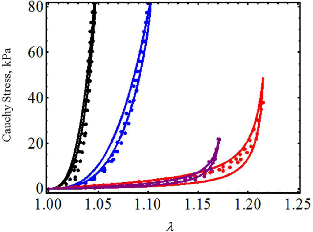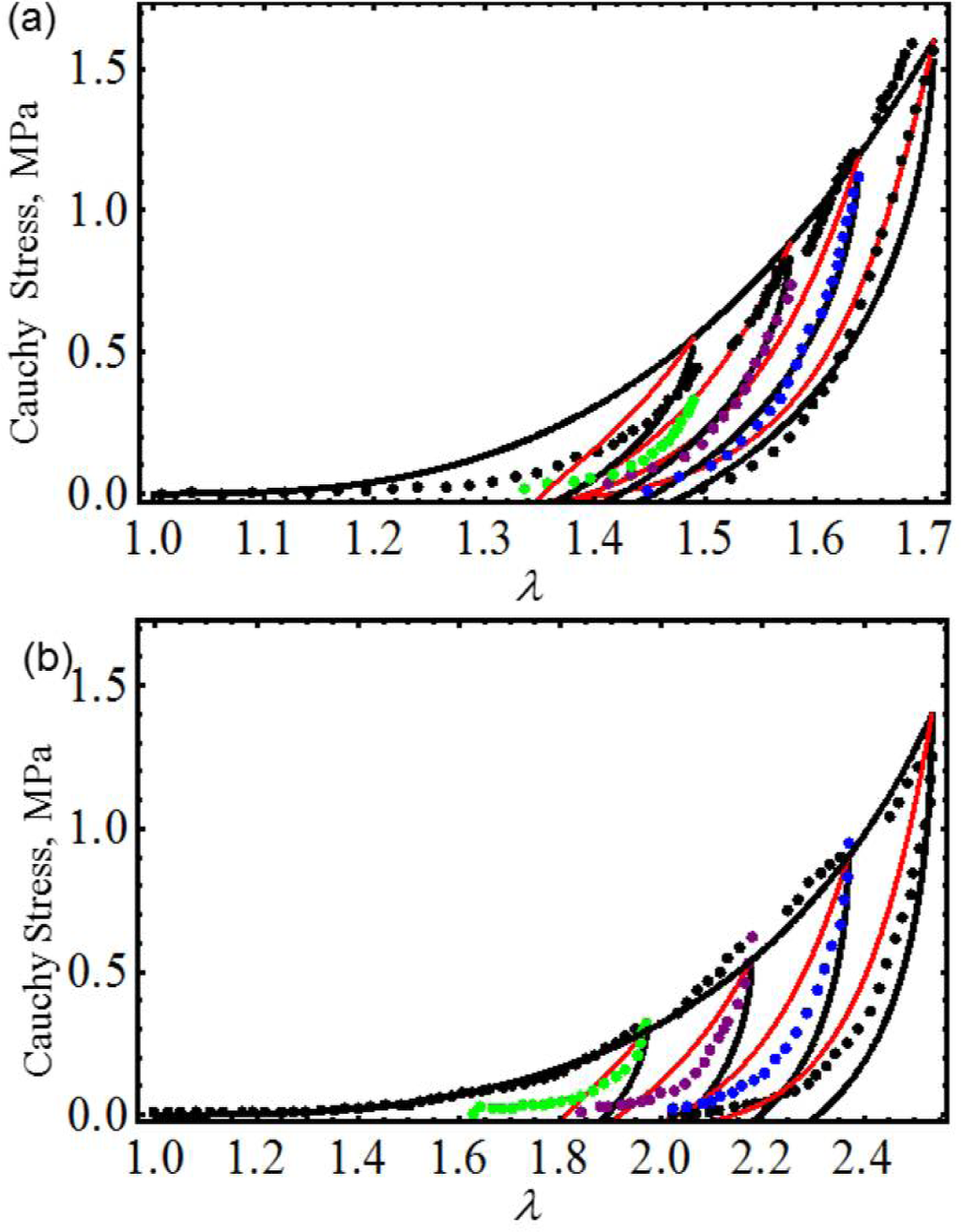 We first start by considering uniaxial extension experimental data collected from samples of vaginal tissue subjected to loading and unloading cyclic tests along the longitudinal and transverse axes of the biological tissue samples [17]. Figure 2 shows the computed loading and unloading engineering stress curves in which stress-softening and permanent set effects are considered. Notice that, in both cases, our proposed equivalent material models not only predict the samples’ stiffness well at low stretch values, but also, they capture stress-softening and permanent set effects. In this case, the material constants used to best fit the experimental data by using the Dorfmann and Ogden material model have the value of c = −0.0284 J/m3, m1 = 1.8, r1 = 1.0001, r2 = 0.1 and γ = 0.3, for the longitudinal and transverse samples of specimen I. The material parameters, μ, N, A1, A2, b, C and f, of Equation (23) are listed in Table 1. Here, the solid black lines describe the theoretical predictions obtained from our proposed model Equation (23), the red solid lines are theoretical predictions computed from Dorfmann and Ogden pseudo-elastic material model Equation (26), while the color dots represent experimental data.