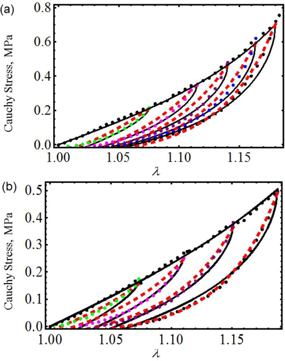 We next use experimental data collected from cyclic loading and unloading of 18-month male and female mice skin [18]. Figure 3 illustrates that theoretical predictions obtained from both material models closely follow experimental data. Here, c = 0.0994 J/m3, m1 = 0.0525, r1 = 1.00001, r2 = 0.55 and γ = 0.55 for male mouse and c = 0.7741 J/m3, m1 = 0.05, r1 = 1.001, r2 = 0.04 and γ = 0.55 for female mouse. The material constants of Equation (23) used to fit experimental data are summarized in Table 1. Once again, in Figure 3, the solid black and the red dashed lines represent theoretical predictions computed from Equations (23) and (26), respectively, while the color dots describe experimental data. Similar accuracy was achieved by Ehret and Itskov by using a thermodynamically consistent dissipative model to describe the softening phenomena in anisotropic materials [19]. However, their model requires the determination of nine material constants in each case, to capture softening and residual strain effects, while the material model described by Equation (23) only needs the determination of seven material parameters.