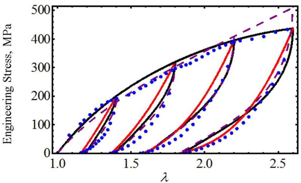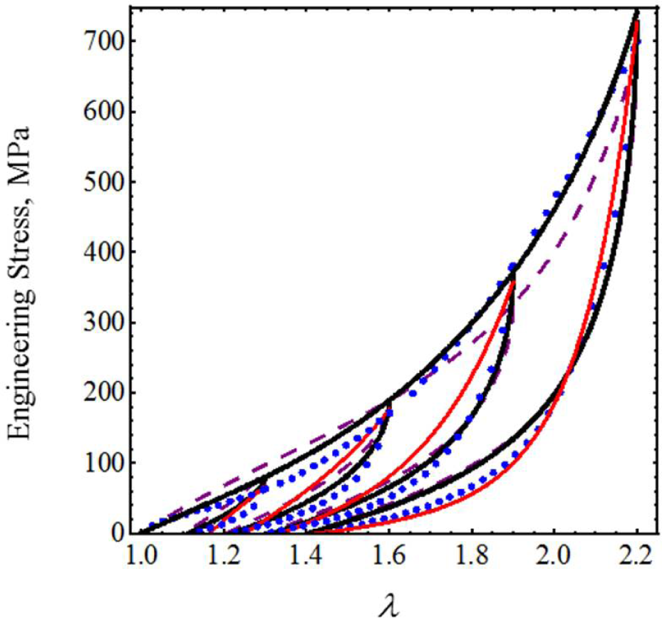 To further assess the accuracy of our proposed equivalent energy material model, we now use cyclic loading-unloading uniaxial stress-stretch data from poly(glycolide-co-caprolactone) (PGC25 3-0) and polypropylene suture material samples collected from an Instron tensile machine model 3365 with a maximum cell load capacity of 1.6 kN [20]. As we can see from Figures 4 and 5, the predicted stress-stretch curves computed from Equations (19) (solid black lines) and Equation (26) (red solid lines), to characterize the mechanical response of both suture material samples, describe the qualitative and quantitative behavior exhibited by the experimental data well (blue dots). In fact, our theoretical predictions are close to those reported in Figures 7 and 9 (dashed purple lines) of [20] in which an amended isotropic, hyperelastic non-Gaussian Arruda–Boyce material model was used. The material constants used to best fit the experimental data are listed in Table 1.