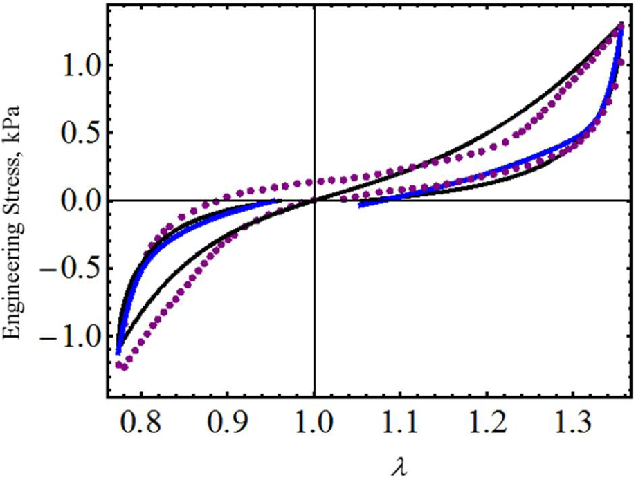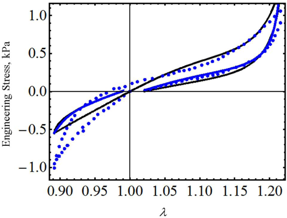 As a final example, let us consider the experimental data collected from human brain tissue that exhibits Mullins and residual strain effects, which are qualitatively similar to that observed in filled elastomers. Experimental data plotted in Figures 7 and 8 were obtained from two tests, one involving compression and subsequent tension (specimens of white matter harvested from the frontal lobe in the sagittal direction) and another involving tension and subsequent compression (specimens of white matter harvested from the occipital lobe in the frontal direction) [23]. We next use derived equivalent constitutive material model Equations (19) and (26) to predict both compression and tension tests. Theoretical simulations obtained from Equations (19) and (26) are illustrated in Figures 7 and 8 by the black and the blue solid lines, respectively. The corresponding material constants for both tests are summarized in Table 3. One must notice that both material models Equations (19) and (26) capture experimental stress-softening and permanent set effects well. In fact, the model described by Equations (17) and (19) closely follows the experimental data (black dots) collected from the occipital lobe in the frontal direction and shows some discrepancies with respect to data collected from the frontal lobe in its frontal direction. These computed predictions have better agreement with experimental data than those obtained from the material model developed in [23] in spite of having neglected the material viscoelastic effects.