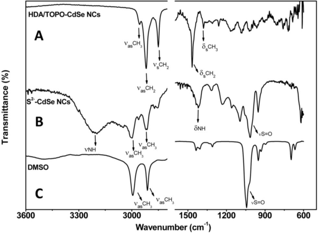 The surface of the CdSe NCs, before and after treatment with (NH4)2S, has been studied by ATR-FTIR infrared spectroscopy in order to verify the effective accomplishment of the exchange of pristine HDA/TOPO ligands with S2− ions. Figure 1 compares spectra of the pristine HDA/TOPO-capped CdSe NCs, of the S2− stabilized CdSe NCs and of DMSO.