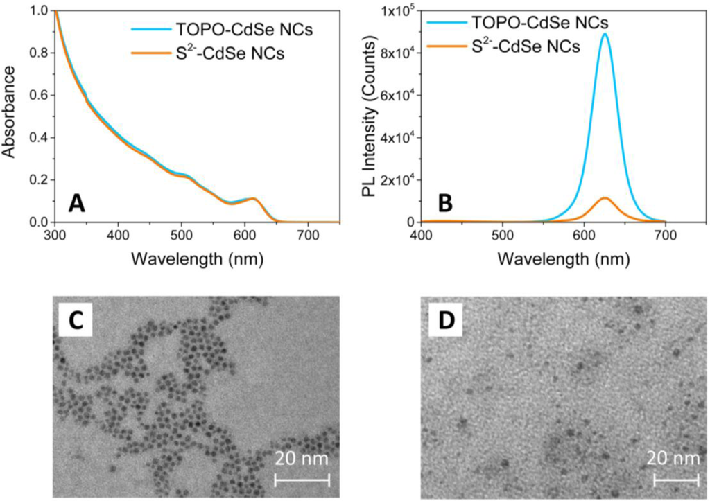 Characterization by TEM and UV-Vis spectroscopy of the CdSe NCs has been performed in order to evaluate the preservation of the morphological and optical properties of colloidal nanostructures after the capping exchange. Figure 2 shows the comparison between the UV-Vis absorption (Panel A), photoluminescence (PL) emission spectra (Panel B) and TEM images (Panels C and D) of the HDA/TOPO-capped and of the S2−-stabilized CdSe NCs.