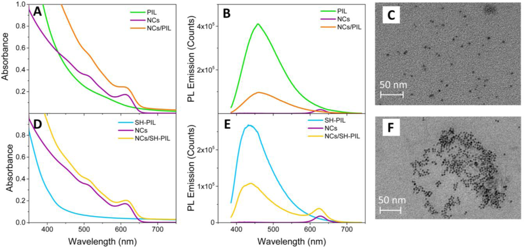 Figure 3 shows the comparison among the UV-Vis absorption (Panel A) and PL emission (Panel B) spectra of the CdSe NCs/PIL nanocomposites and of both the bare components. UV-Vis absorption (Panel D) and PL emission (Panel E) spectra of the SH-PIL-based nanocomposites and of the corresponding bare components are also provided.