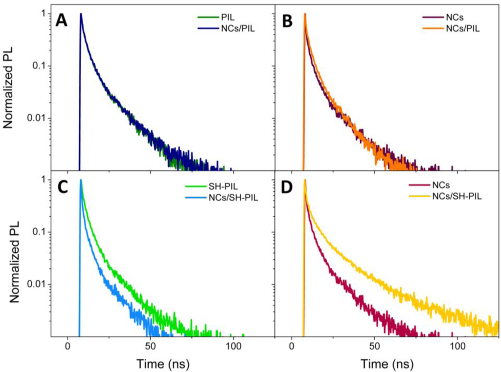 Figure 4 reports normalized PL decays of nanocomposite DMSO dispersions, compared to those of the bare components, in correspondence with the PIL and CdSe NC fluorescence peak. In particular, Panel A shows the PL decays of the PIL and the CdSe NC/PIL DMSO dispersion detected at 458 nm, which is the wavelength of maximum intensity of PIL fluorescence (see Figure 3B). Figure 4B reports the comparison between similar decays of NC/PIL nanocomposite and the S2−-capped CdSe NCs, revealed at the NC band-edge peak emission, namely 626 nm (see Figure 3B). Analogously, Figure 4C reports the comparison between PL decays of the SH-PIL and of the corresponding nanocomposite DMSO dispersion, detected in correspondence with the SH-PIL PL maximum intensity (436 nm) (see Figure 3E). Instead, Figure 4D shows the comparison between PL decays of the CdSe NCs and of the SH-PIL based nanocomposite, revealed at the CdSe NC band-edge PL maximum emission (626 nm) (see Figure 3E).