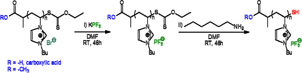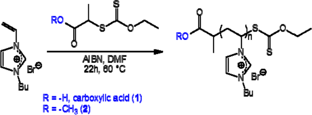 Azobis(2-methylpropionitrile) (AIBN, 99%) was received from Aldrich and purified by recrystallization from methanol. N-vinylimidazole (99%) and 1-bromobutane (99%) were obtained from Alfa Aesar and used as received. Potassium hexafluorophosphate (KPF6, >98%) was received from Roth and used as received. O-Ethyl-S-[(1-methoxycarbonyl)ethyl] dithiocarbonate (1 in Scheme 1) and O-ethyl-S-[(1-methoxycarbonyl)ethyl] dithiocarbonate (2 in Scheme 1) were prepared following a procedure already described [44,45]. Hexylamine (99%, Sigma-Aldrich, Seelze, Germany), dimethylformamide (DMF) (≥99.7%, Scharlau, Barcelona, Spain), tetrahydrofuran (THF) (99.5%, Fischer, Germany), acetone (99.5%, VWR, Fontenay-sous-Bois, France), diethyl ether (anhydrous, Baker, Deventer, Netherlands) and pentane (>99.5%, Fluka) were used without further purification.