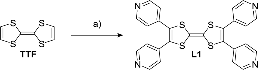 New ligand L1 was obtained in one step from the pristine TTF through a Palladium-catalyzed C–H cross-coupling reaction [52,53] with 4-iodopyrine (Scheme 1). This reaction is run in good yields (71%) when taking into account that four C–C bonds are simultaneously formed.