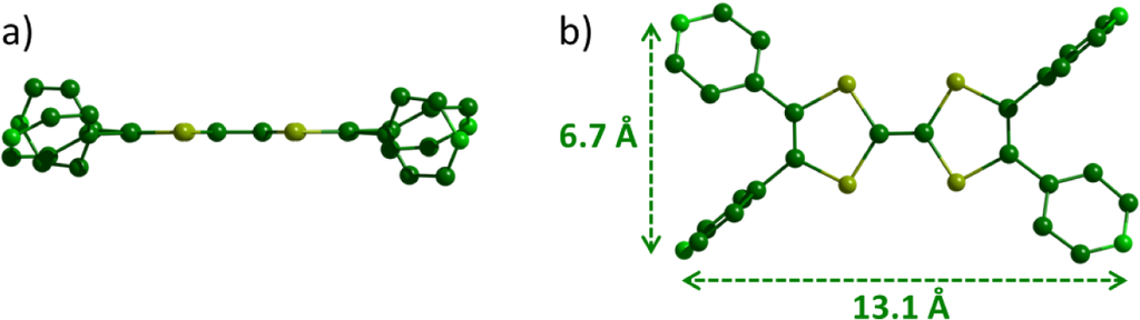 Single crystals of ligand L1 were obtained by slow diffusion of hexane in a solution of L1 in dichloromethane. The XRD analysis (Tables S1) revealed that the TTF skeleton and the four nitrogen atoms are coplanar (Figure 1a) and set in a rectangle defined by a length of 13.1 Å and a width of 6.7 Å (Figure 1b). The electro-deficient pyridile plans are highly rotated related to the TTF backbone (i.e., between 31° and 77°) and are therefore poorly conjugated to the donating part of the molecule. Consequently, the π-donating ability of ligand L1 should be only moderately altered compared to the parent TTF.