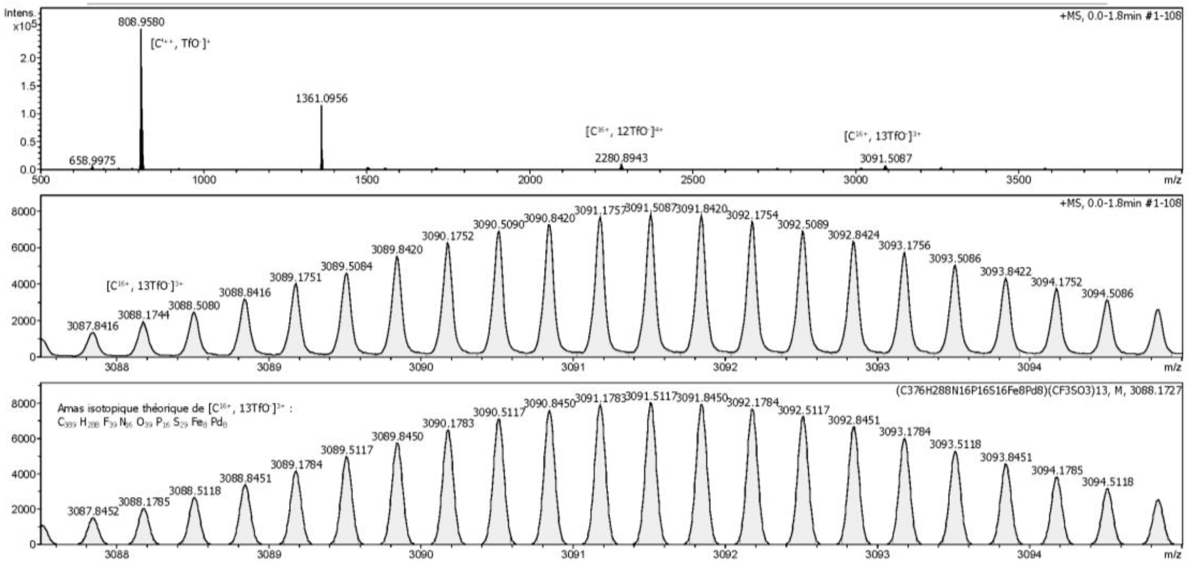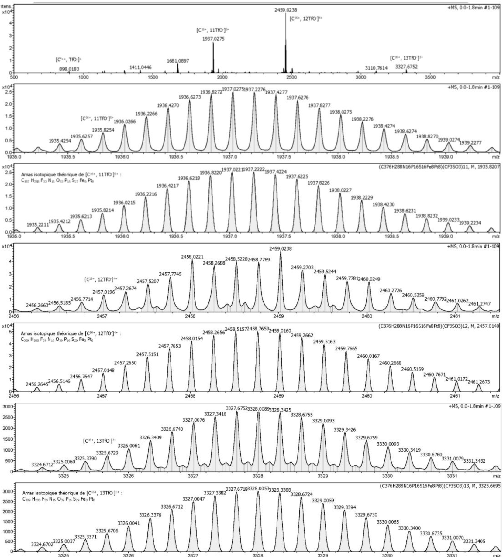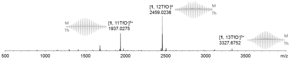 High resolution ESI mass spectrometry experiments were carried out from dichloromethane solutions of 1 (Figure 3 and Figure S13) and 2 (Figure S14) and confirm the formation of M8L4 architectures with peaks corresponding to multi-charged species [M-3TfO−]3+ (m/z = 3327.6752 (1) and 3091.5087 (2)), [M-4TfO−]4+ (m/z = 2459.0238 (1) and 2280.8943 (2)) and [M-5TfO−]5+ (m/z = 1937.0275 (1)), as well as a good matching between the experimental and theoretical isotopic patterns.
