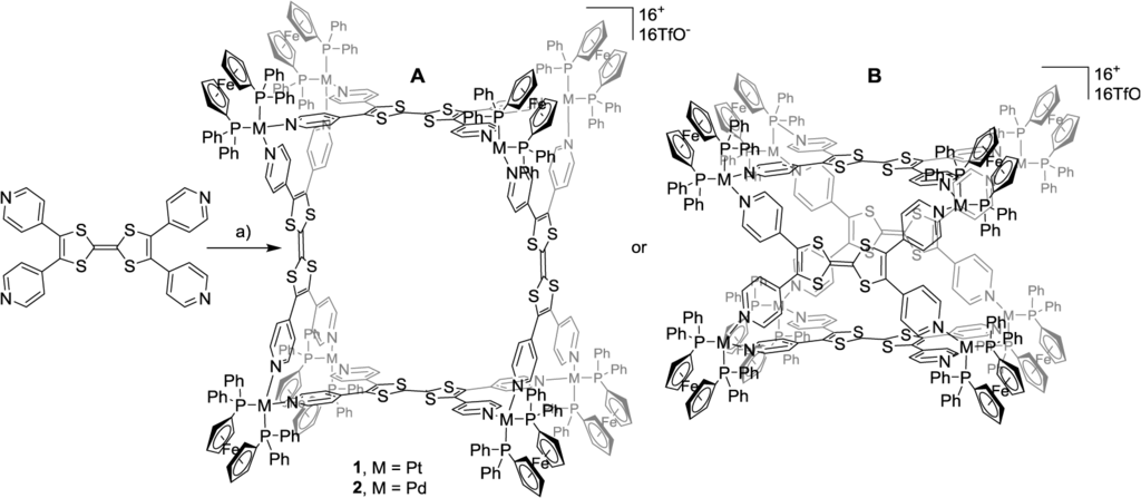 Two self-assembled redox-active cages are presented. They are obtained by coordination-driven self-assembly of a tetra-pyridile tetrathiafulvalene ligand with cis-M(dppf)(OTf)2 (M = Pd or Pt; dppf = 1,1′-bis(diphenylphosphino)ferrocene; OTf = trifluoromethane-sulfonate) complexes. Both species are fully characterized and are constituted of 12 electro-active subunits that can be reversibly oxidized.1. Introduction