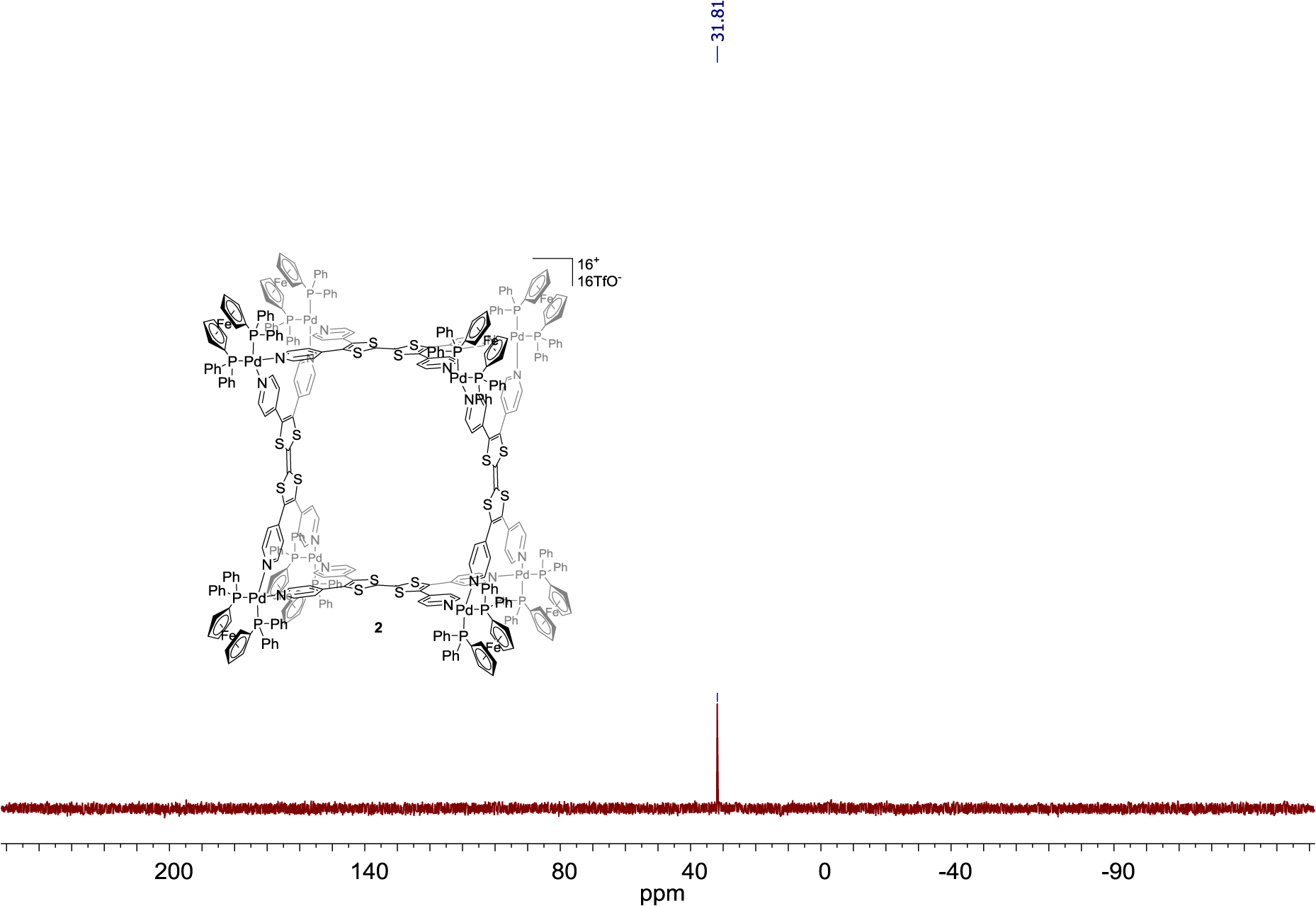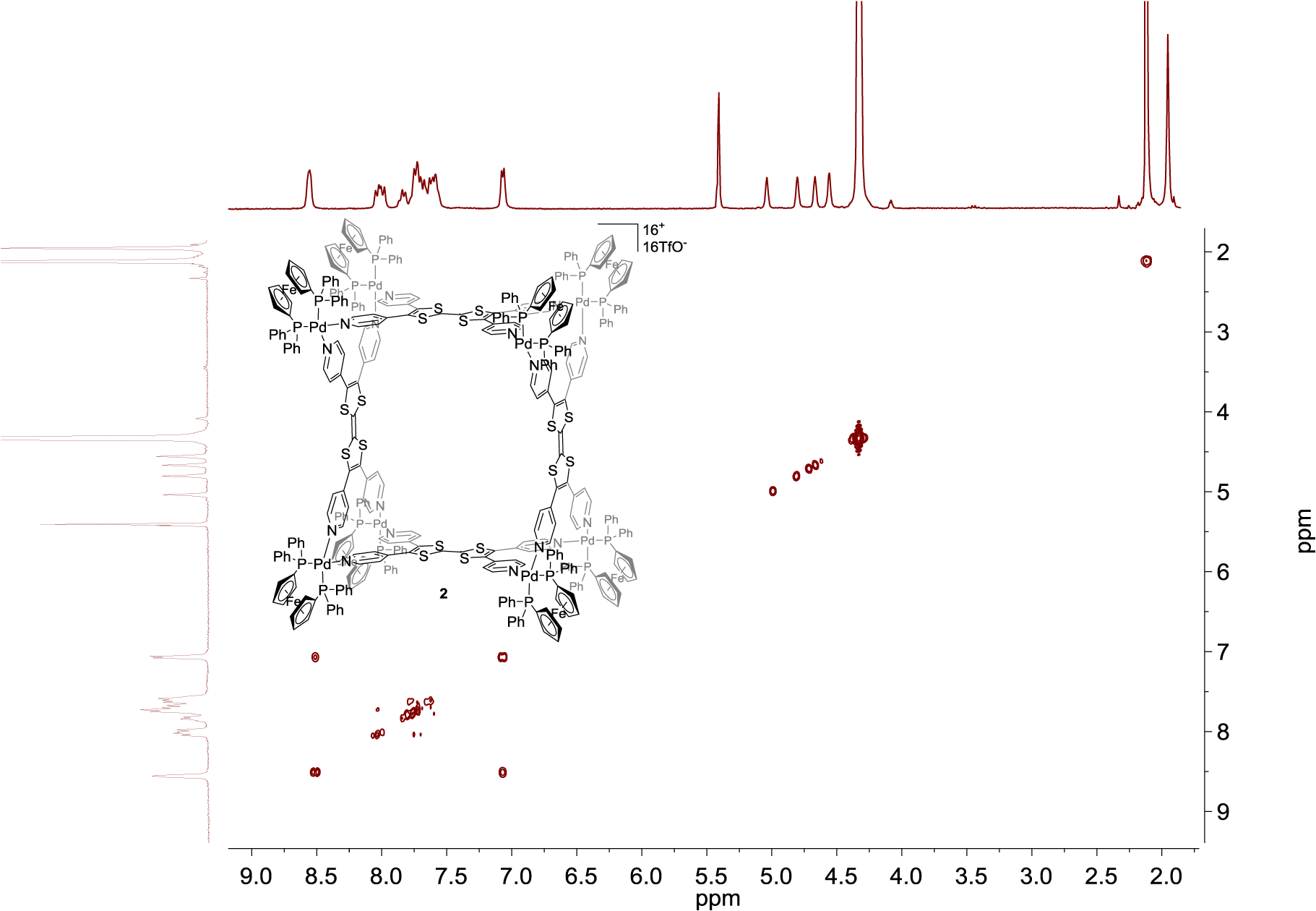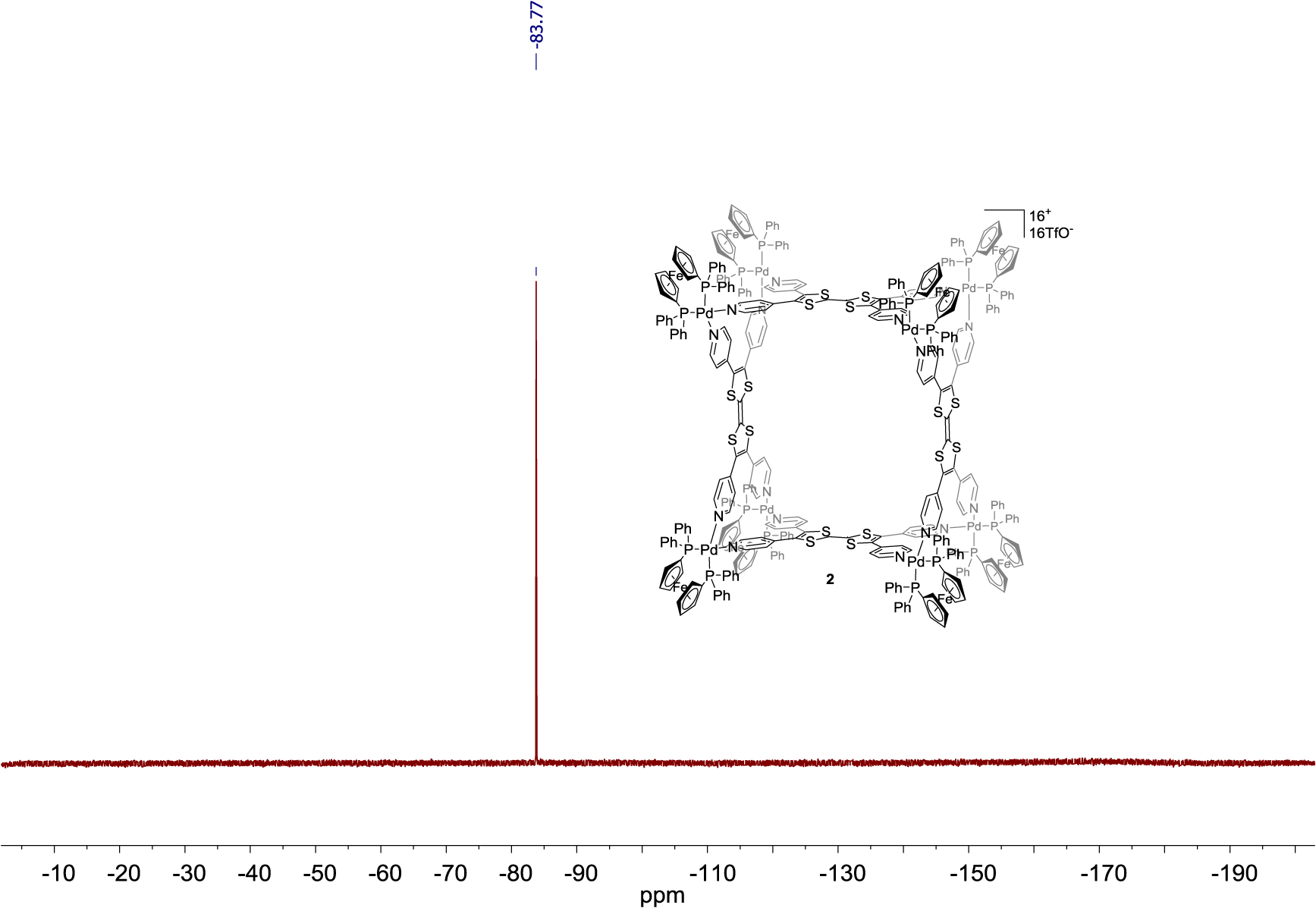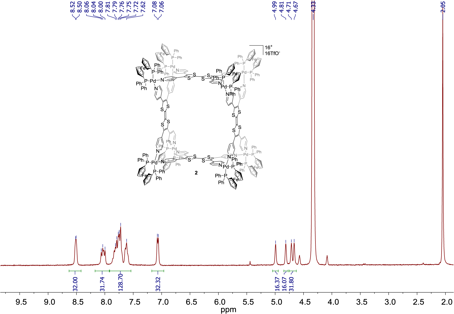 A mixture of ligand L1 (10.0 mg, 19.5 μmol) and cis-Pd(dppf)(OTf)2 (37.4 mg, 39.1 μmol) in anhydrous nitromethane (2 mL) was heated at 50 °C for 5 min under argon. After cooling, diethyl ether (10 mL) was added and the mixture was centrifuged. The residue was washed with diethyl ether and dried under vacuum to give complex 2 (41.2 mg, 4.2 μmol, 87%) as a dark red solid. 1H NMR (CD3NO2) δ = 8.51 (d, 3J = 5.9 Hz, 16 H), 8.04 (m, 32 H), 7.81–7.62 (m, 128 H), 7.07 (d, 3J = 5.9 Hz, 16 H), 4.99 (brs, 16 H), 4.81 (brs, 16 H), 4.71 (brs, 16 H), 4.67 (brs, 16 H); 19F NMR (CD3NO2) δ = 83.77; 31P NMR (CD3NO2) δ = 31.81; ESI-MS m/z: 2280.8943 ([2-12OTf]4+), 3091.5087 ([2-13OTf]3+); mp > 260 °C.