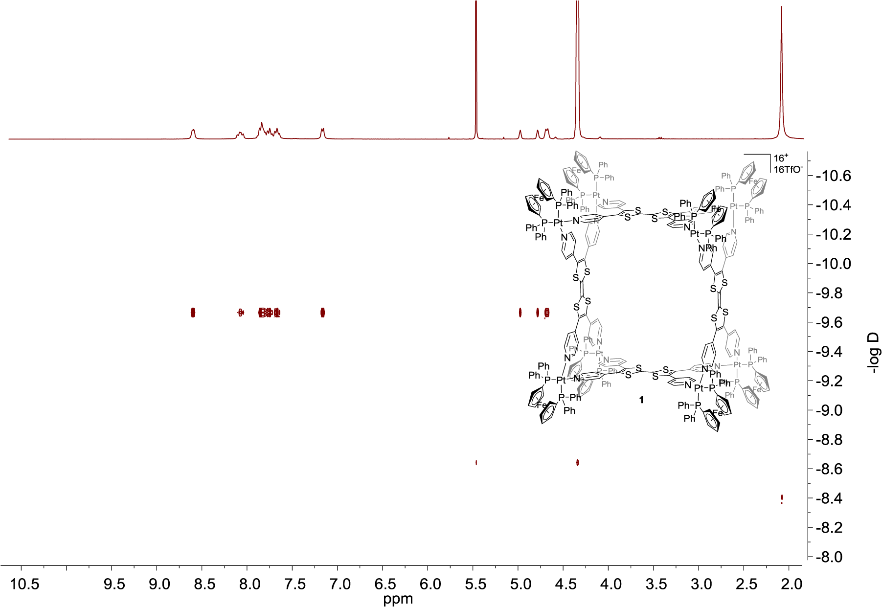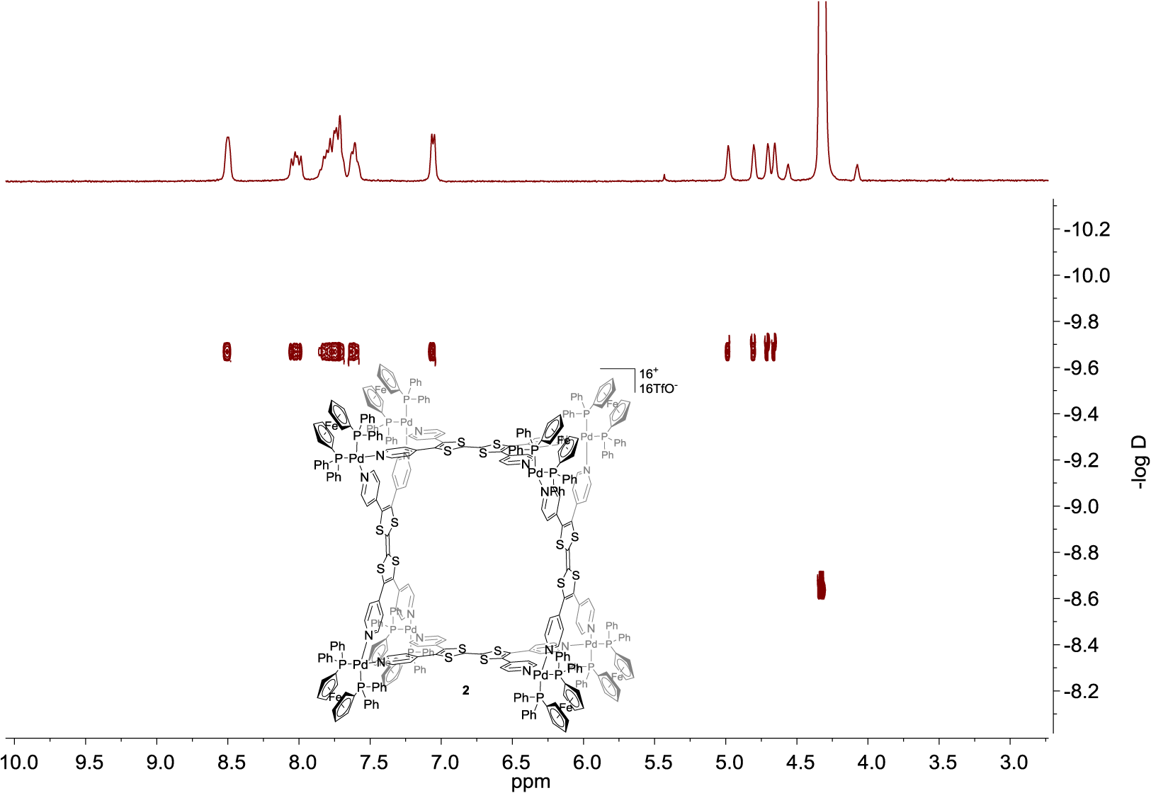 Remarkably, both self-assemblies present the same diffusion coefficient in solution (D ≈ 2.2 × 10−10 m2·s−1) extracted from the DOSY experiments. This result indicates that both species are of similar size with an estimated hydrodynamic radius of ca. 16.5 Å calculated from the Stokes-Einstein equation [54]. This value is in line with the formation of a large discrete self-assembled architecture but does not allow discriminating between a M6L3 or a M8L4 species.
